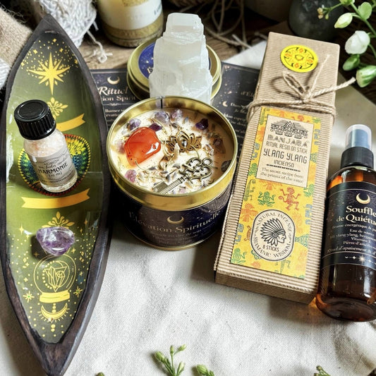 La Box Élévation Intérieure – Trésor de Sorcière a été pensée comme un véritable rituel… un moment suspendu, rien que pour toi. Dans ta box tu trouveras des outils soigneusement sélectionnés pour t’accompagner dans ton cheminement intérieur, te libérer, te recentrer… et te reconnecter à ton essence profonde.
