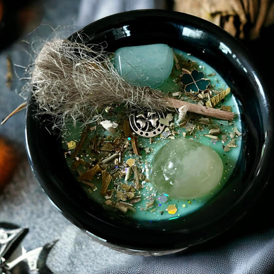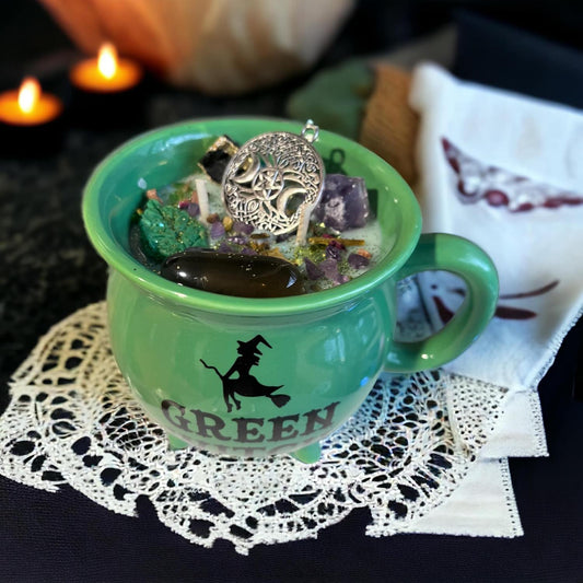Bougie chaudron "green witch", bougie d'intention, bougie sorcière