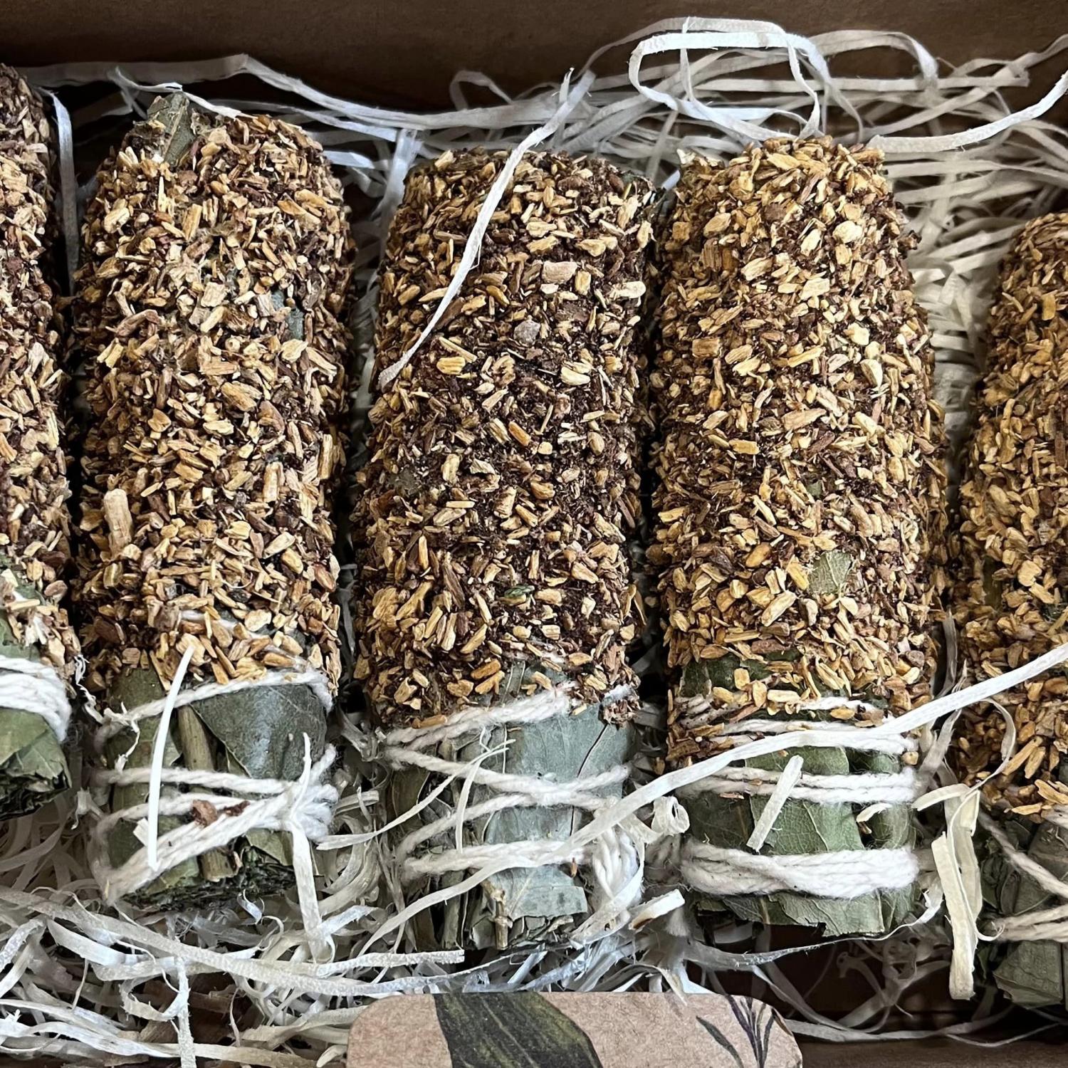 "Sahumitos" fait référence à de petits paquets ou préparations d'herbes séchées qui sont allumés et laissés à couver, produisant une fumée parfumée. Ces smudges sont souvent utilisés dans des rituels, des cérémonies ou des pratiques personnelles pour purifier l'énergie d'un espace, conjurer les influences négatives et inviter les énergies positives.