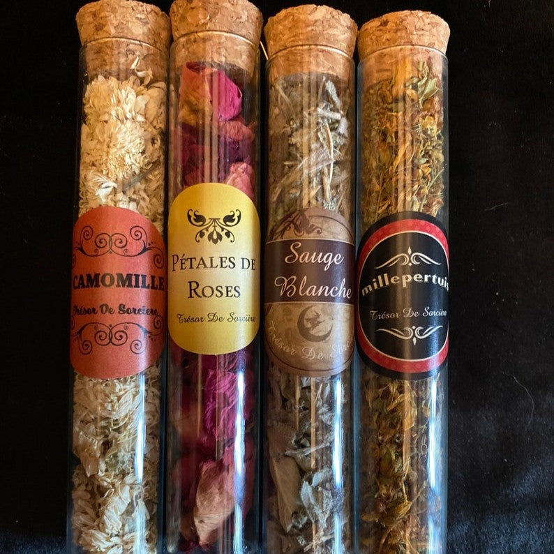 Lot de 4 fioles en verre remplies de sauge blanche, d’armoise, de lavande et de roses séchées. Pour vos rituels ou pour vos réalisations magiques Hauteur 13 cm. Herbes pour accompagner votre pratique magique, pour la création de vos rituels de vos poudres et encens magique, pour vos rituels de bain.