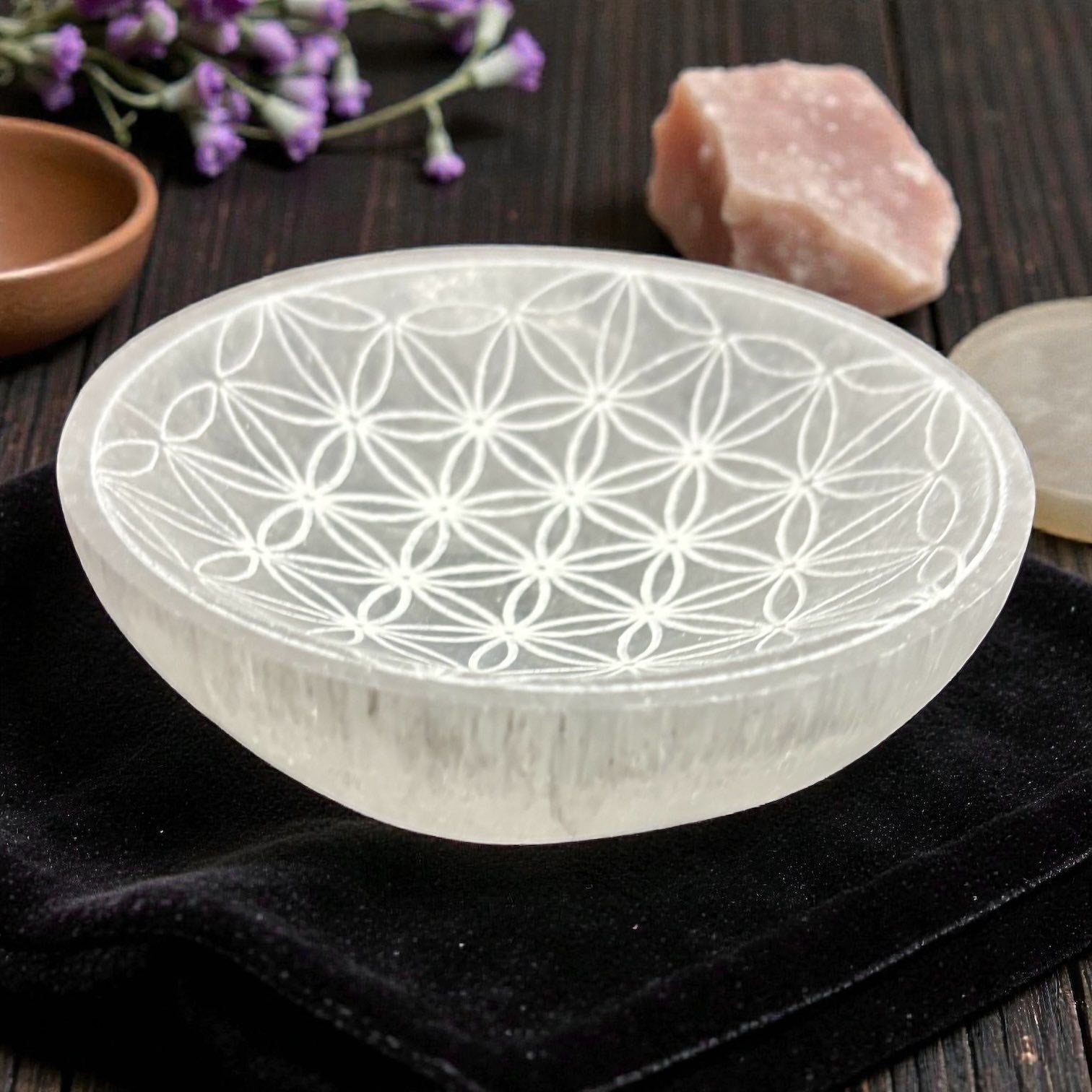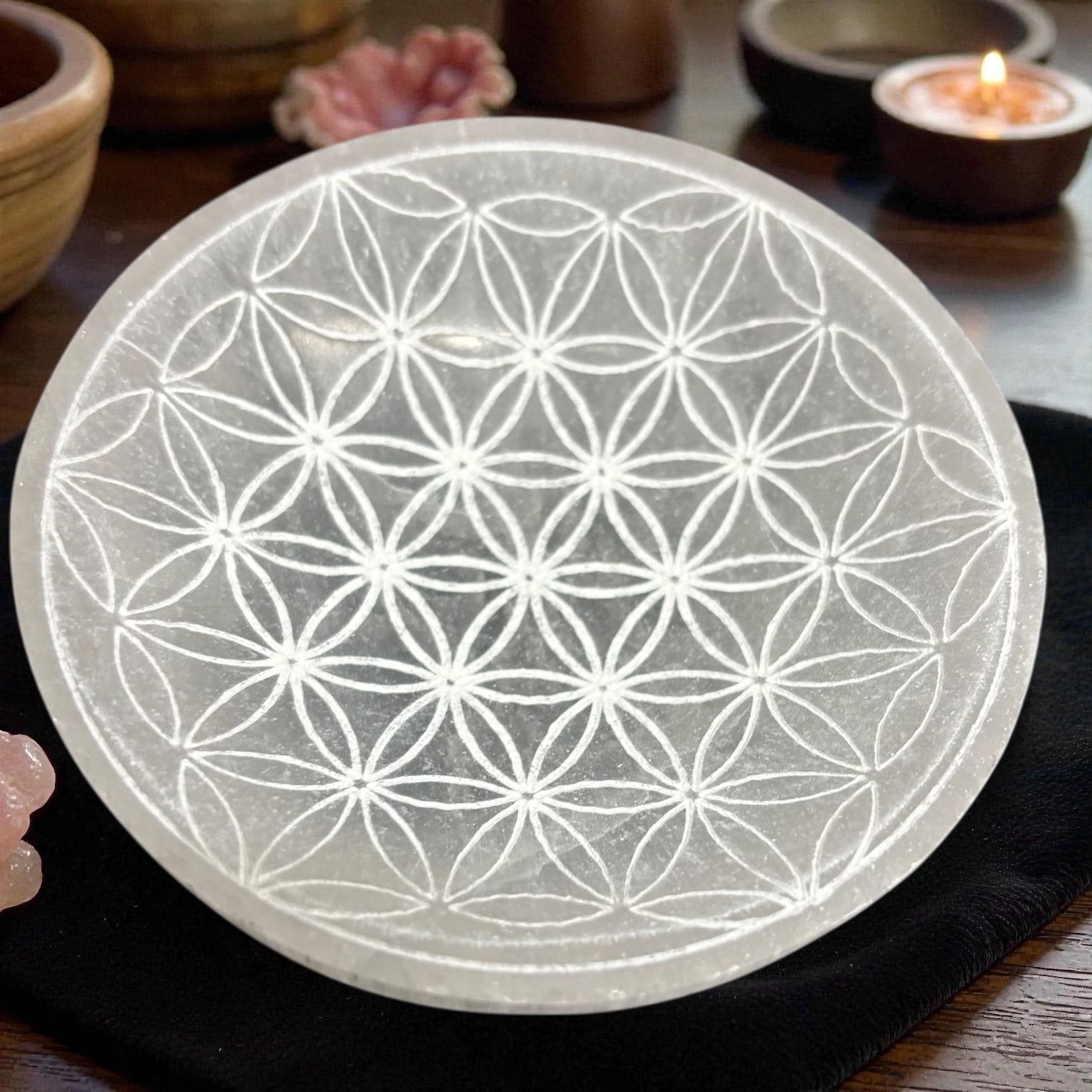 bol de sélénite, bol fleur de vie, pierre de sélénite