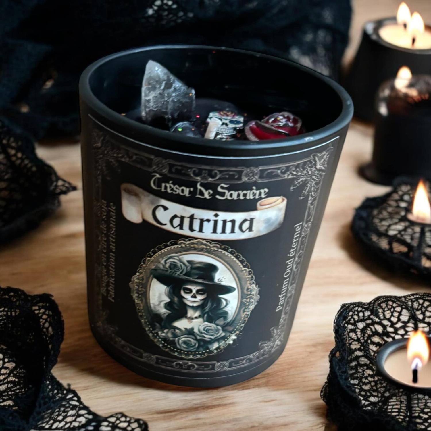 Bougie La Catrina. La Catrina est un symbole sacré ancré dans la culture mexicaine qui symbolise la façon dont les mexicains voient la mort et l'au delà. La Catrina représente le choix des Mexicains d'honorer et de célébrer la vie de ceux qu'ils ont perdus au lieu de concentrer sur le fait qu'ils sont partis pour toujours. Elle sera parfaite pour célébrer le jour des morts. Cette bougie est ornée d'une pointe de quartz fumé et d'une obsidienne noire, d'un papillon, et d'une tête de mort.
