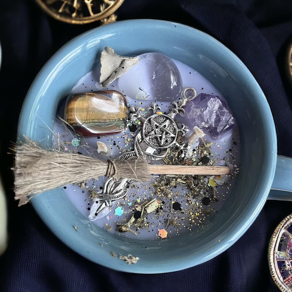 Ce chaudron est orné un pierre d'oeil de tigre, un oeuf de cristal de roche et une pointe d'améthyste.Un grand charme athamé pentacle est placé sur cette bougie.