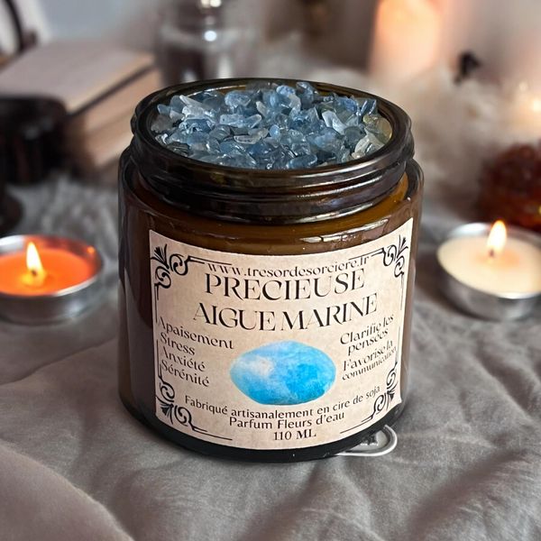 La cire de la bougie est remplie des douces énergies de l'aigue marine qui est une pierre de détente, un bon anti stress. L'une des pouvoir de l'aigue marine est de clarifier le mental et les pensées. C'est aussi une pierre qui favorise la communication. La bougie précieuse aigue marine est une bougie à consommer sans modération, par exemple le soir en rentrant du travail, ou après une journée bien stressante.