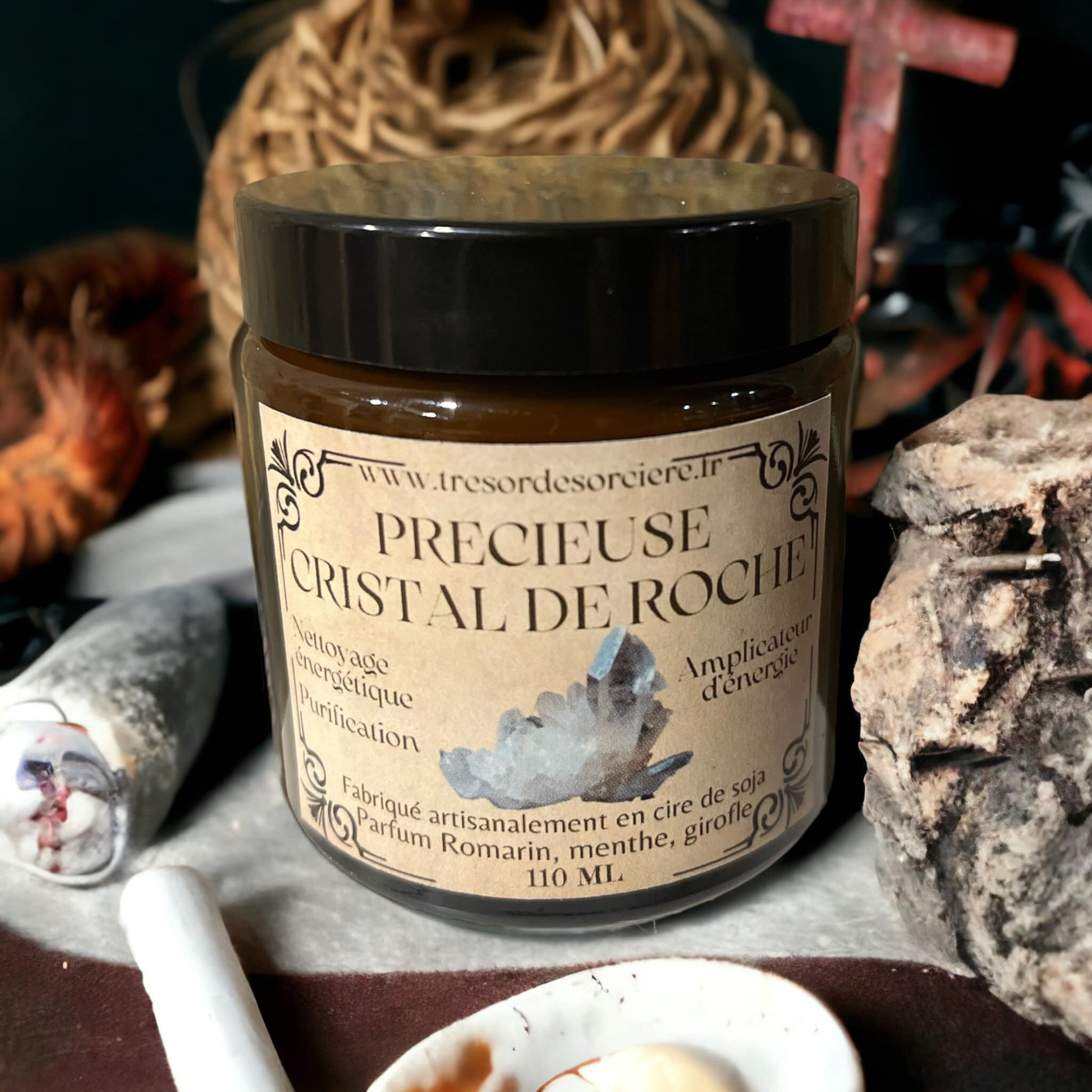 - Précieuse cristal de roche : Purifiez sa maison de temps en temps est indispensable car cela permet de dégager les énergies mauvaises et les larves énergétiques. Cette bougie est parfaite pour cela, elle est parfumée au romarin, clous de girofle et chargée de cristal de roche qui est un excellent amplificateur d'énergies. Idéal pour ressentir a nouveau l'harmonie dans la maison.