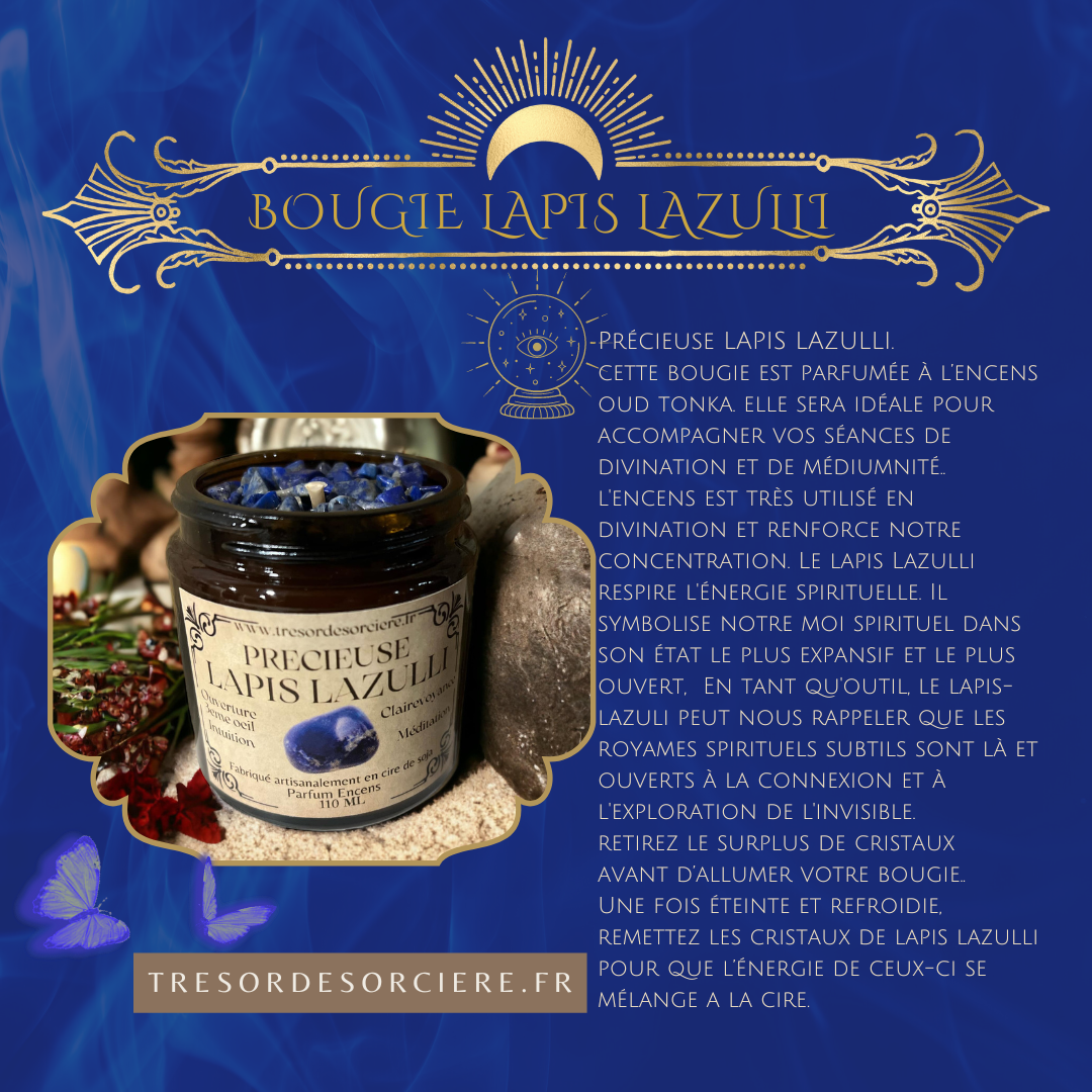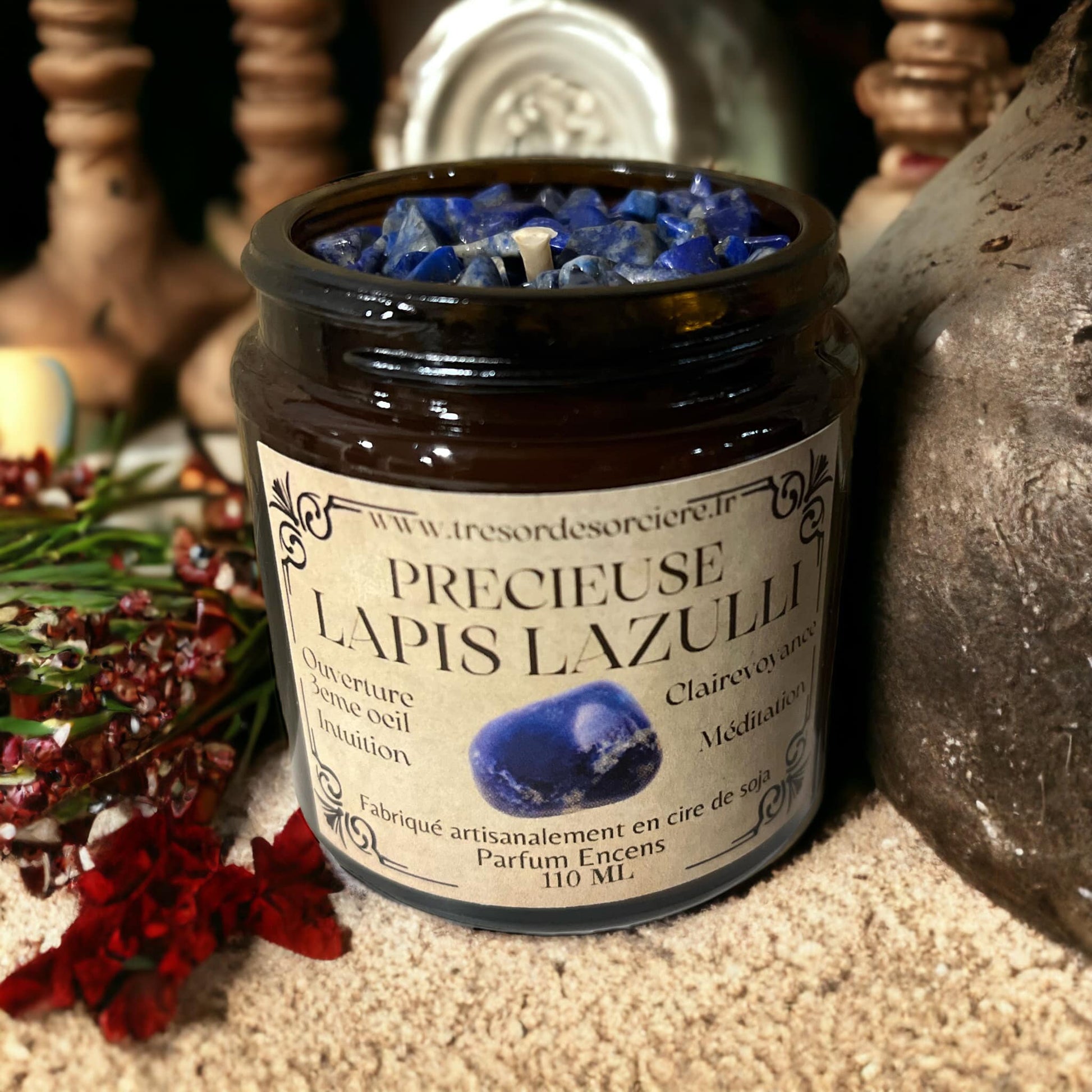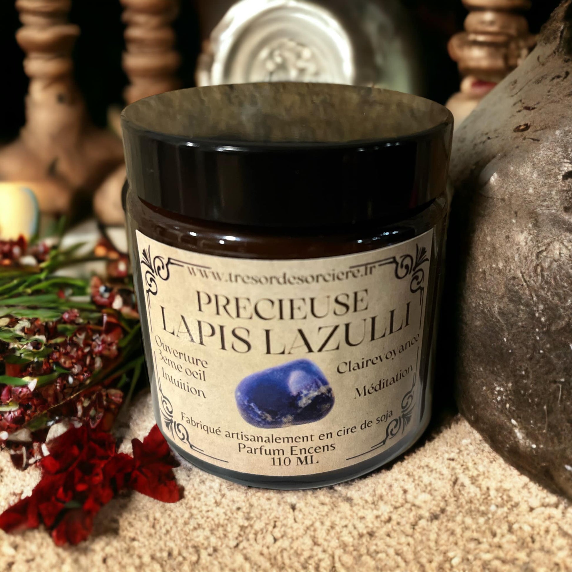 Précieuse Lapis lazulli : Cette bougie est parfumé avec un parfum épicé et mystérieux d'encens et chargé avec des pierres de lapis lazulli, pierre en lien avec le troisième oeil et la divination