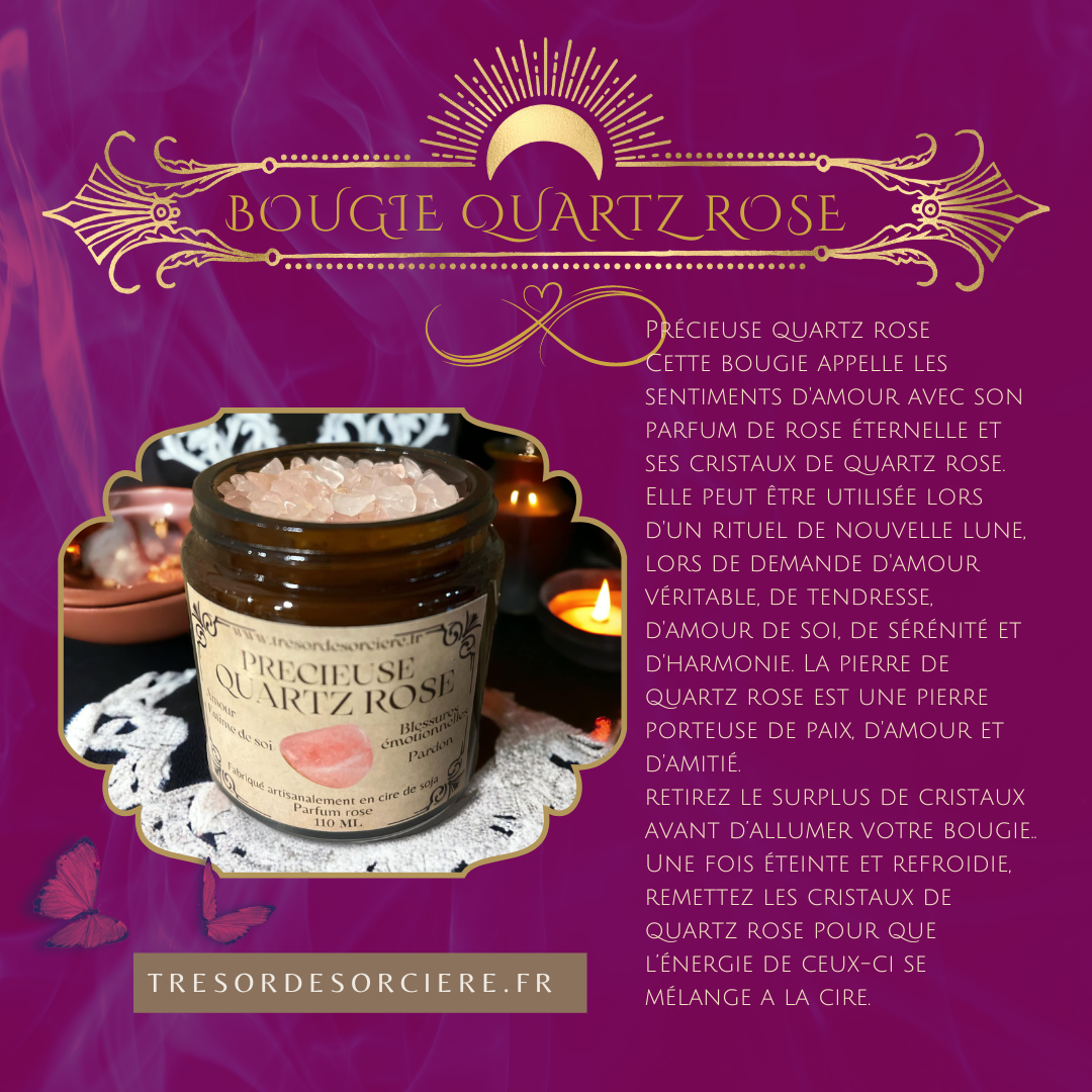 Précieuse quartz rose : Cette bougie appelle les sentiments d'amour avec son parfum de rose éternelle et ses cristaux de quartz rose. Elle peut être utilisée lors d'un rituel de nouvelle lune, lors de demande d'amour véritable, de tendresse, d'amour de soi, de sérénité et d'harmonie.