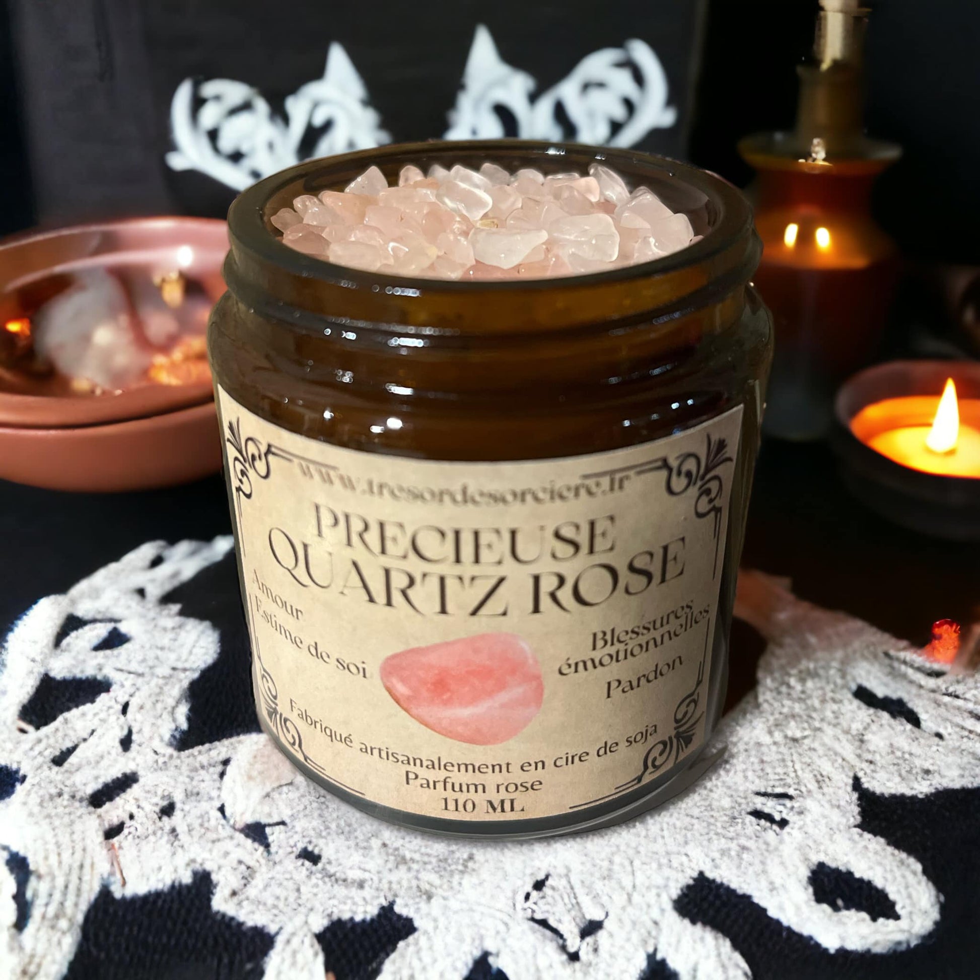 Bougie précieuse quartz rose, bougie d'amour, bougie d'intention