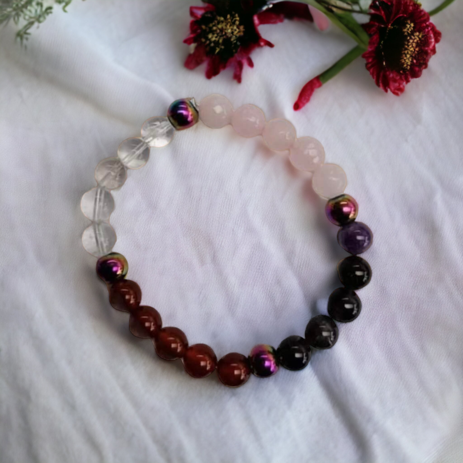 Ce bracelet est une aide pour vous aider à renforcer l'estime de soi. il a été réalisé avec du quartz rose, du grenat, du cristal de roche.
