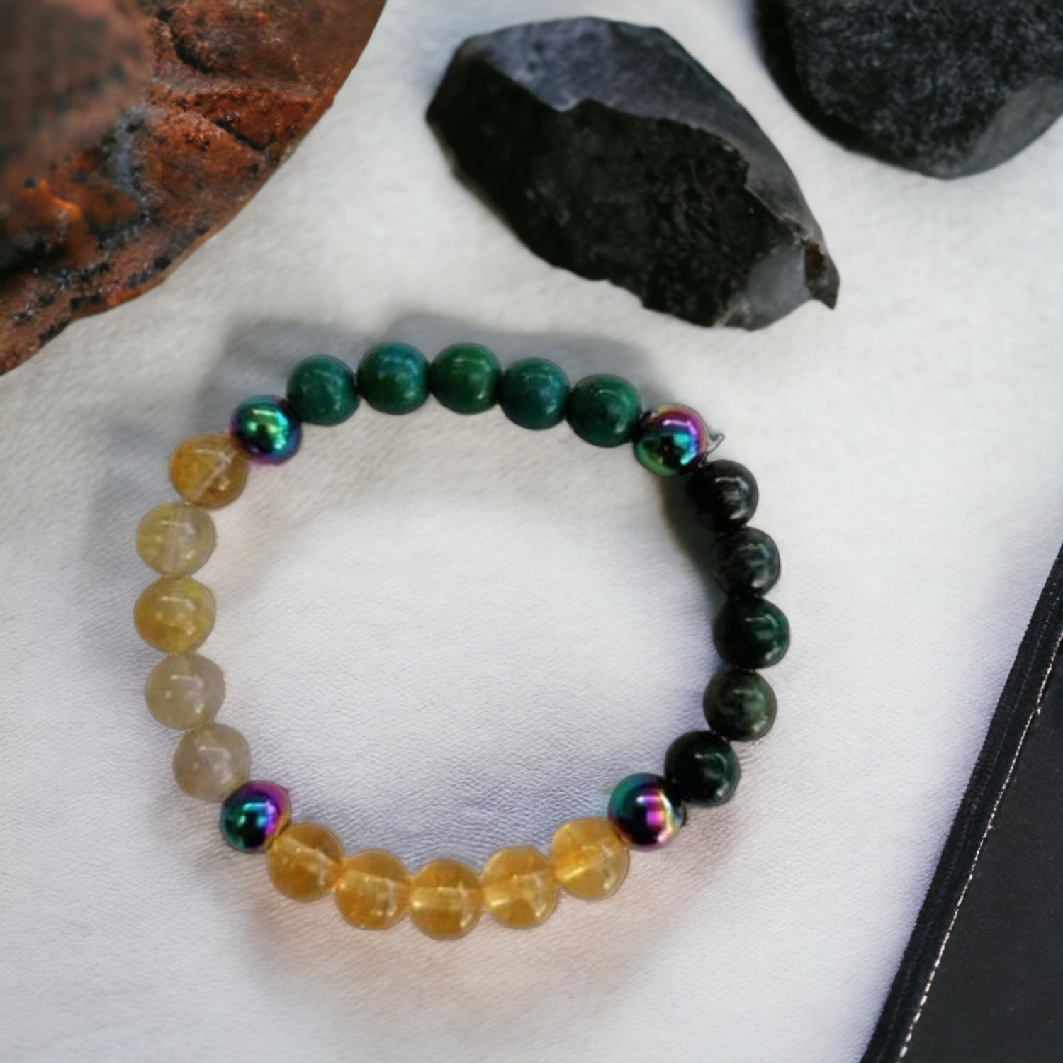 Bracelet peurs et phobies. Il a été réalisé de manière artisanale par Maitre Louis Maitre Reiki pour vous aider à lutter contre les peurs et les phobies. Ce bracelet est composé avec des pierres d'azurite, de citrine, de quartz rutile, chrysocolle.