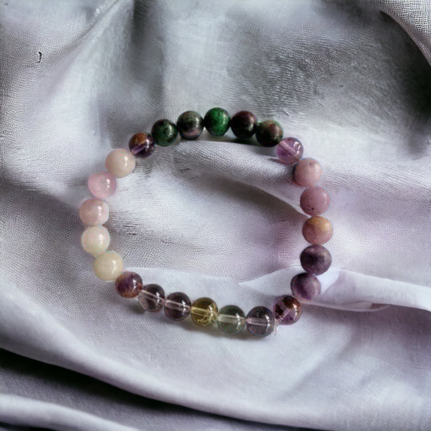 Les intercalaires de ce bracelet sont en super seven : composé de 7 minéraux le super seven est censé posséder la plus haute vibration de tous les minéraux découverts à ce jour. la pierre de super seven n'a nul besoin de rechargement ni de purification. La super seven soutien et intensifie la vibration des autres minéraux de ce bracelet.