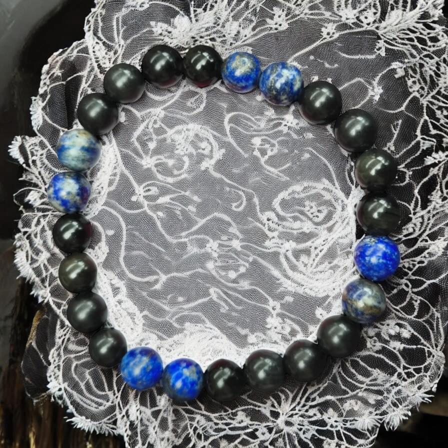 1 bracelet " trinité céleste" fait par Maître louis. Après plusieurs semaines tests de radiesthésie le bracelet trinité céleste est enfin en ligne. Porter ce bracelet, c’est enfiler une armure vibratoire mais aussi une clé de conscience. Ce bracelet en pierres naturelles est un véritable allié du bien être global et un bijou à la fois sobre et puissant, qui veille sur vous, vous ancre, vous apaise, et vous guide doucement vers votre propre centre. Il unit 3 pierres aux énergies profondes et complémentaires, formant une trinité magique de protection, d'éveil et de vérité intérieure. Formée du feu terrestre et de la noirceur originelle, l'obsidienne oeil céleste est une pierre d’une profondeur mystique rare. Elle révèle des reflets à la lumière, symboles de nos différentes dimensions intérieure. Cette pierre agit comme un miroir de l'âme révélant les blessures cachées pour les transmuter. Pierre des anciens rois, des prêtresses et des prophètes, la pierre de lapis lazuli est une passerelle vers le savoir intérieur.