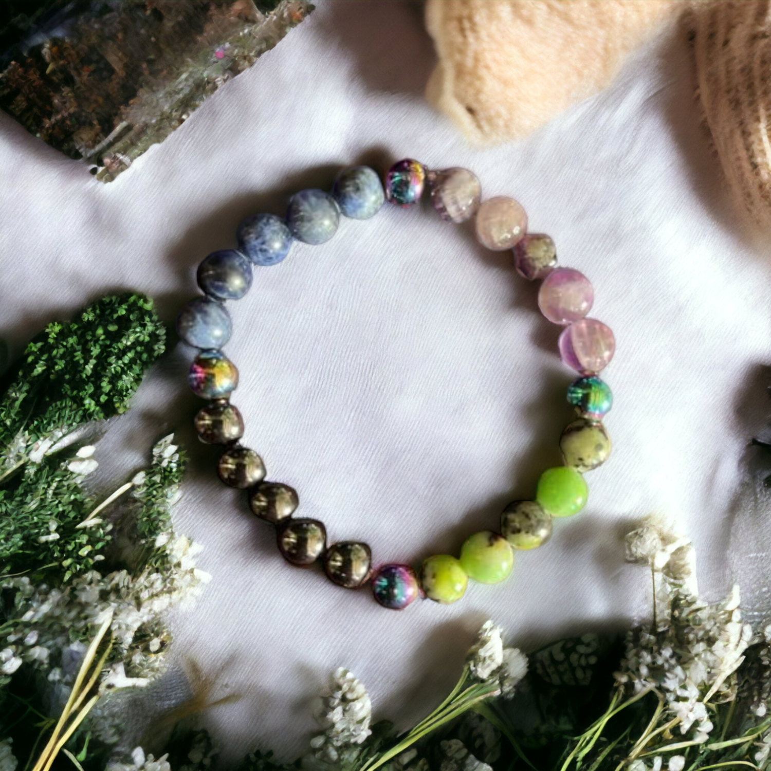 Bracelet aide spirituel aide contre les troubles du sommeil. Ce bracelet est fait et magnétisé au nom de la personne par Maitre Louis. Il a été réalisé avec des pierres de chrysocoles roses, de sodalites, d'améthystes, d'hématites.