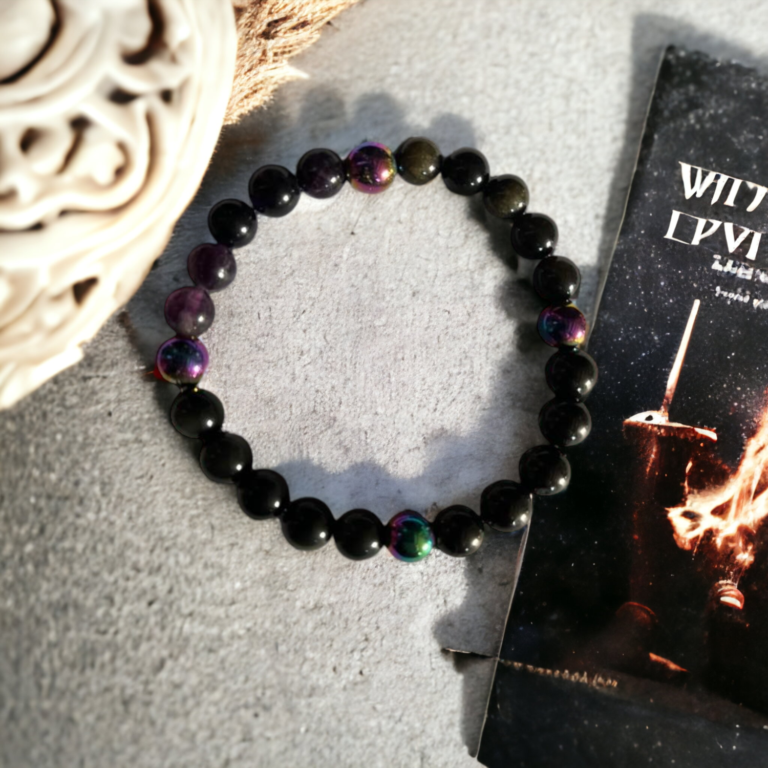 Il a été réalisé avec des pierres d'obsidienne dorée, de jais, de fluorite pourpre, d'obsidienne œil céleste.