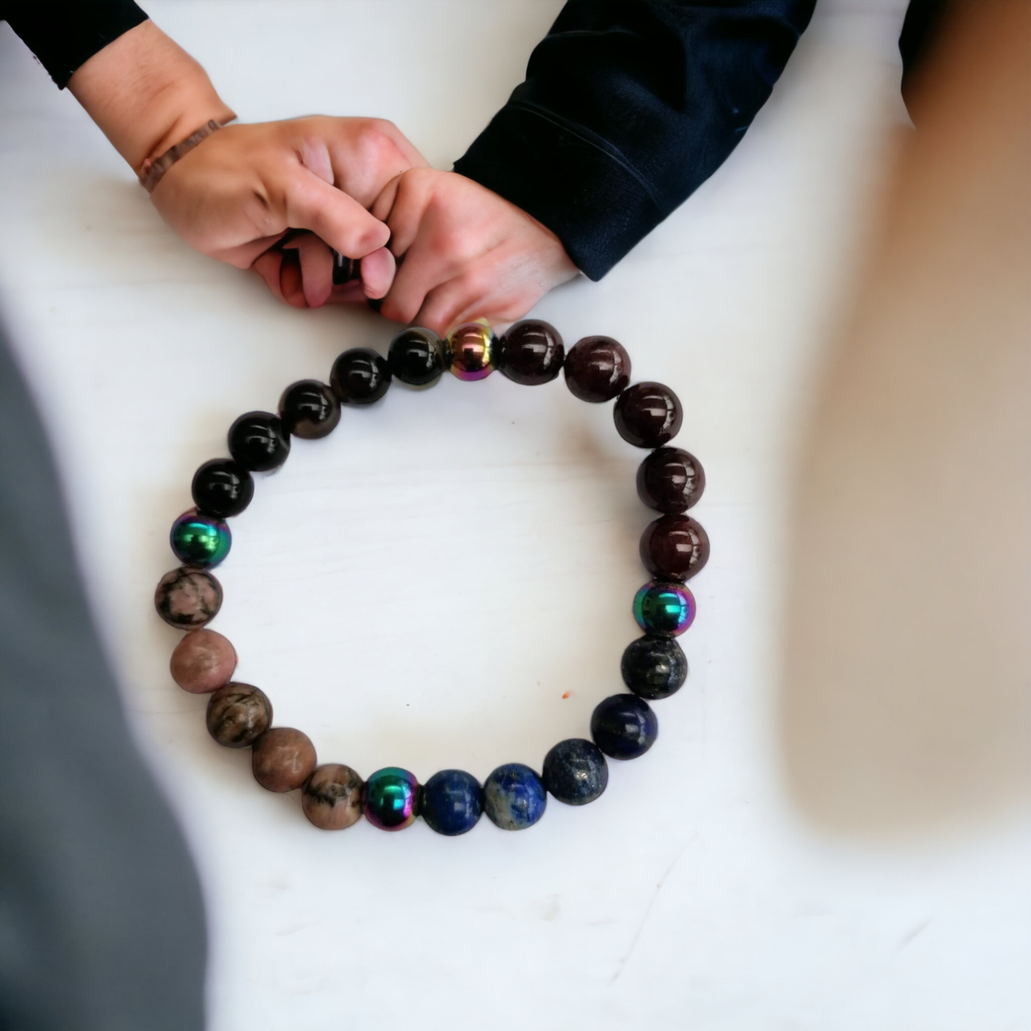 Modèle homme : ce bracelet est composé de grenat, de lapis lazulli, de rhodonite et de sardonyx