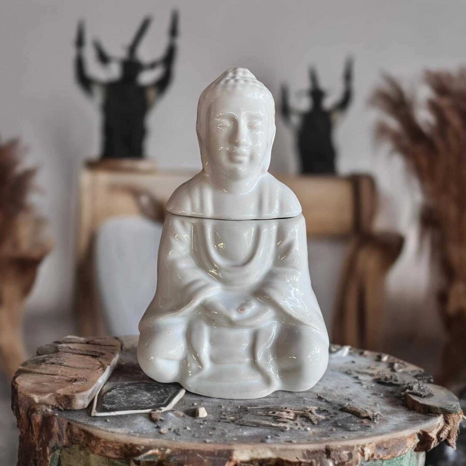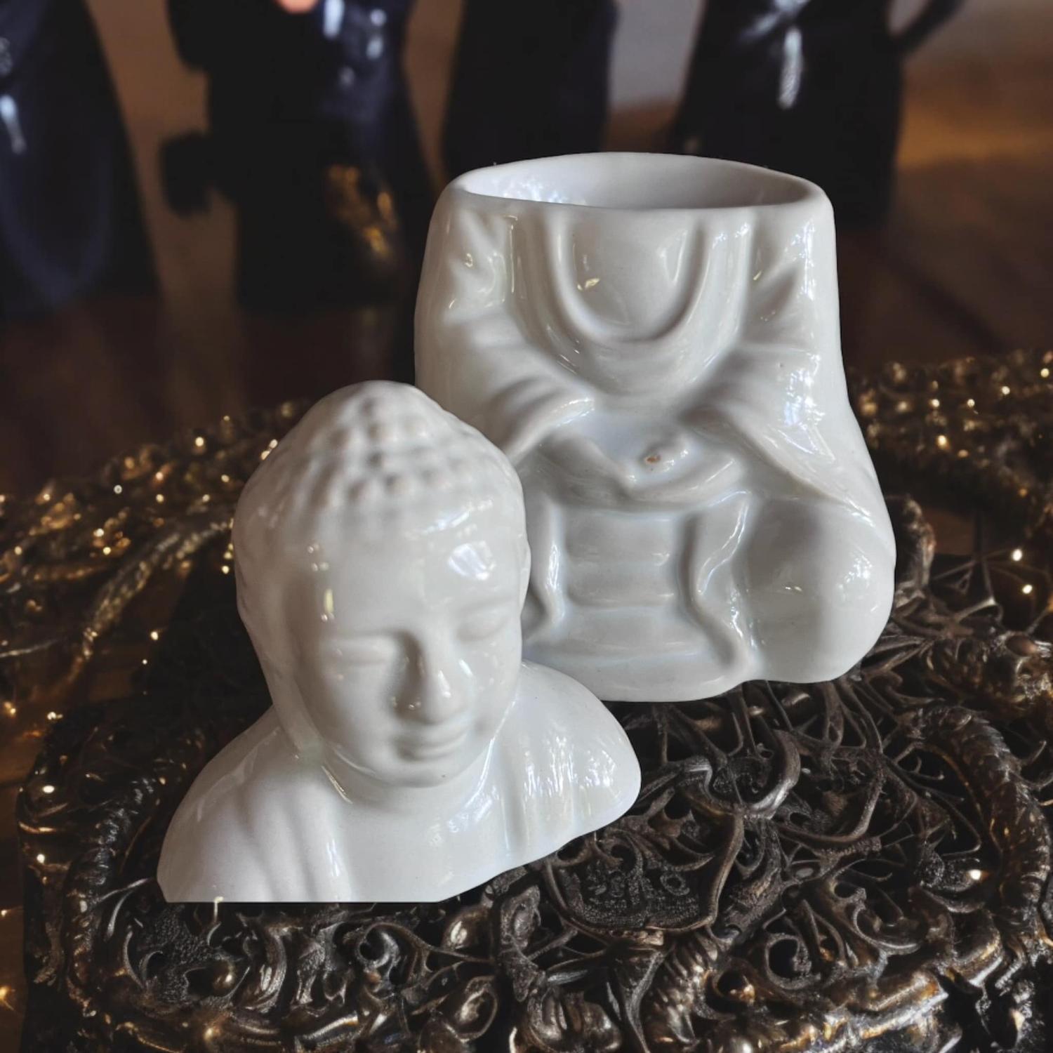 Brûleur de cire décor bouddha qui mesure 14X8X8 cm en céramique qui se referme avec la tête de Bouddha. Son design élégant fera en plus de son utilité une belle décoration dans votre maison.