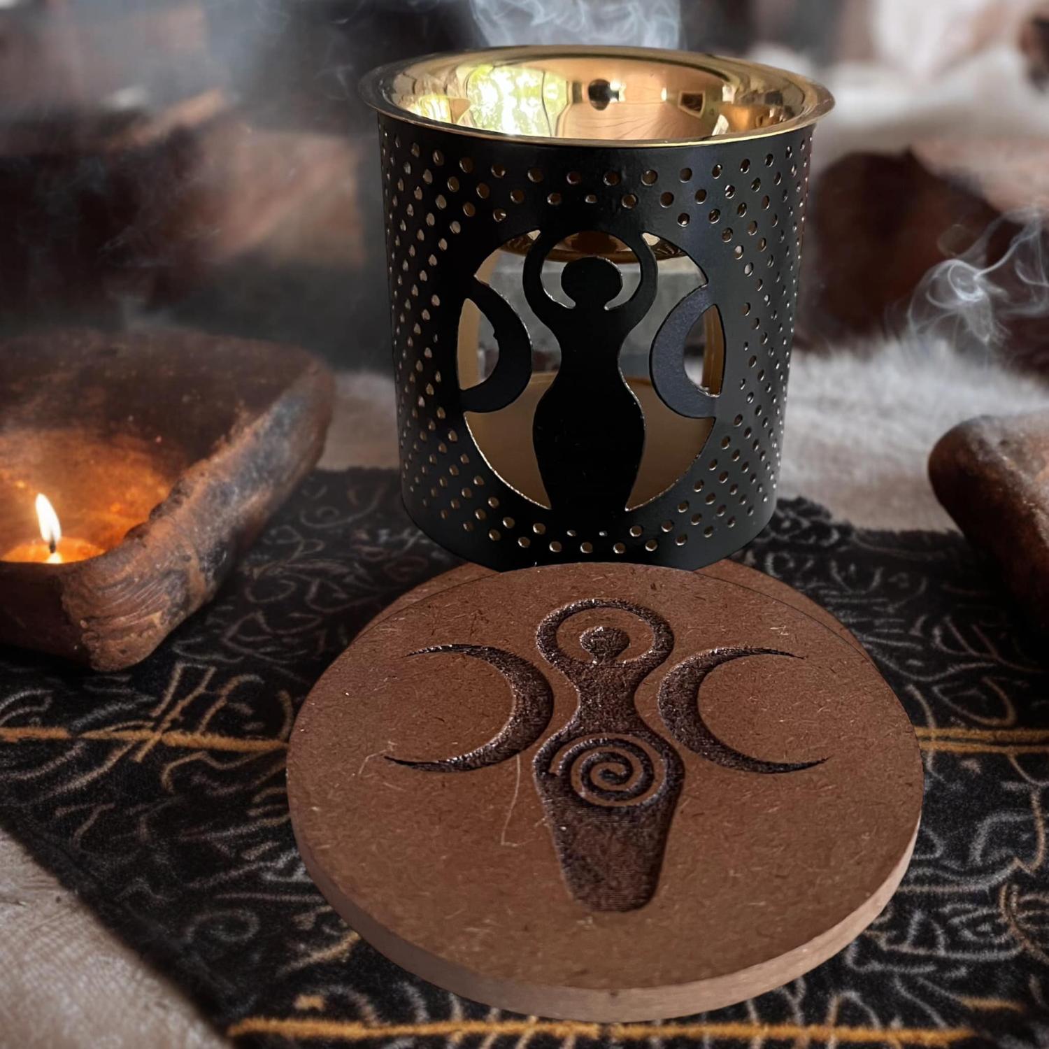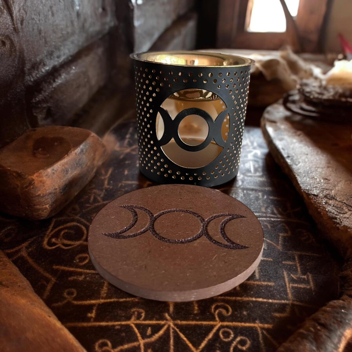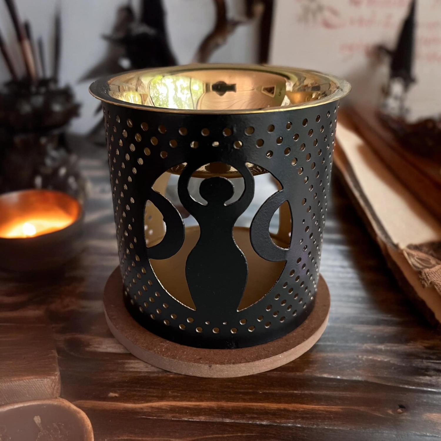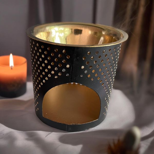 Brûleur à fondants photophore qui ajoutera une touche spirituelle à votre intérieur. Idéal pour brûler vos huiles et vos fondants. il est en métal avec des motifs croissants de lune, sa base est en bois. Il mesure 8,5X 8,5 x 8,5 cm