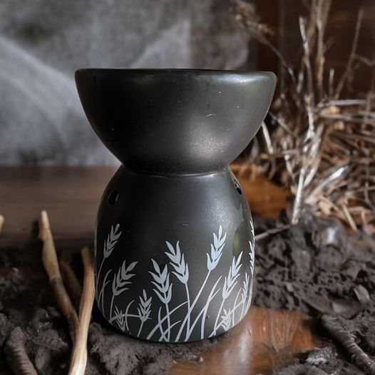 Brûleur à fondants noir avec un décor blé en céramique. Il mesure H12 cm X 8cm X 8cm
