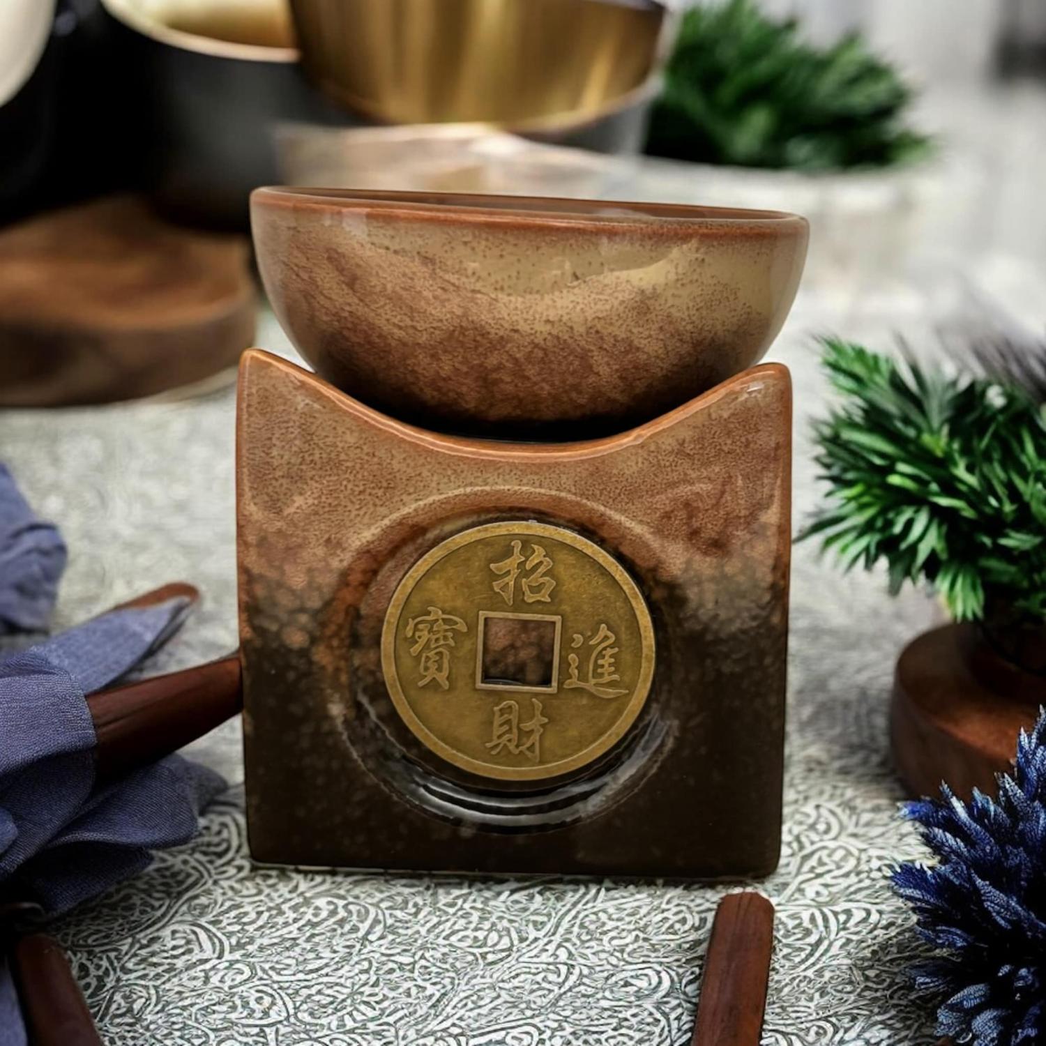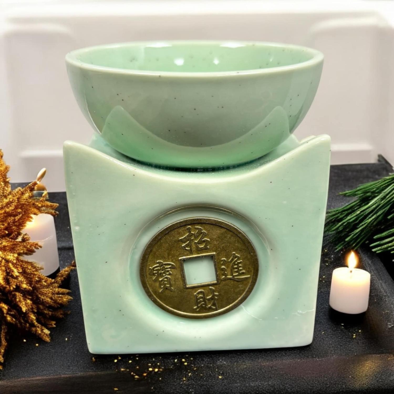 Brûleur vert jade ou marron en céramique décoré avec une pièce chinoise porte bonheur, qui mesure H11cm X L9cm X P9 CM.