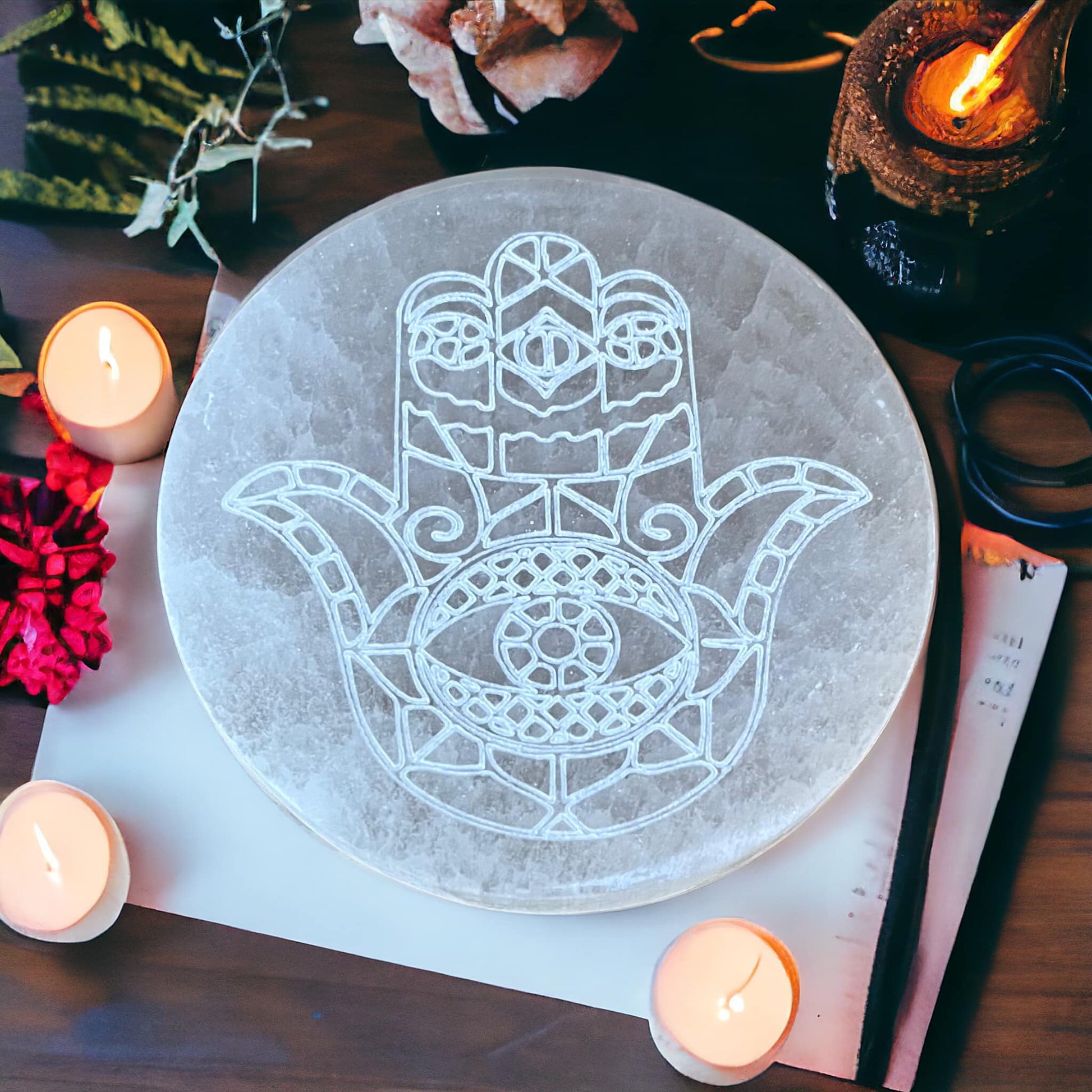 Plaque de rechargement mystique «symbole main de fatma » en sélénite gravée diamètre 10 cm. Epaisseur de la plaque 1 cm.