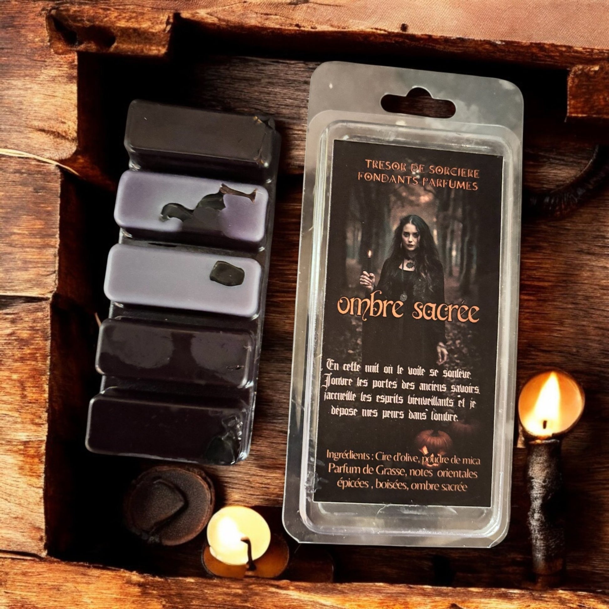 - 1 paquet de 5 fondants Ombre sacrée parfumés avec des notes de clous de girofle, bois de santal, patchouli, encens et fève tonka. Parfait pour célébrer le nouvel an des sorcières ou pour donner à votre demeure une ambiance mystérieuse. Dans cette série, chaque tablette de fondants est unique avec des tons gris et noirs. Des hématites, et obsidienne noire, sont infusées dans la cire de vos fondants.