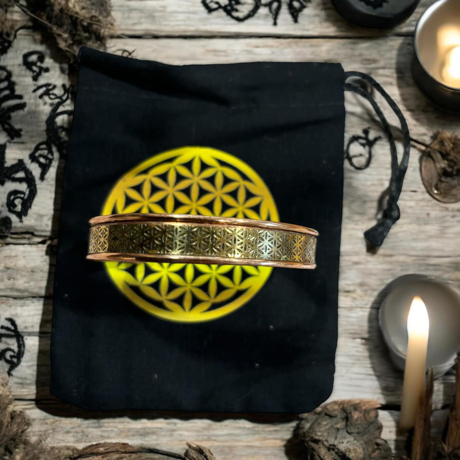 1 bracelet en cuivre fleur de vie zt son sac fleur de vie