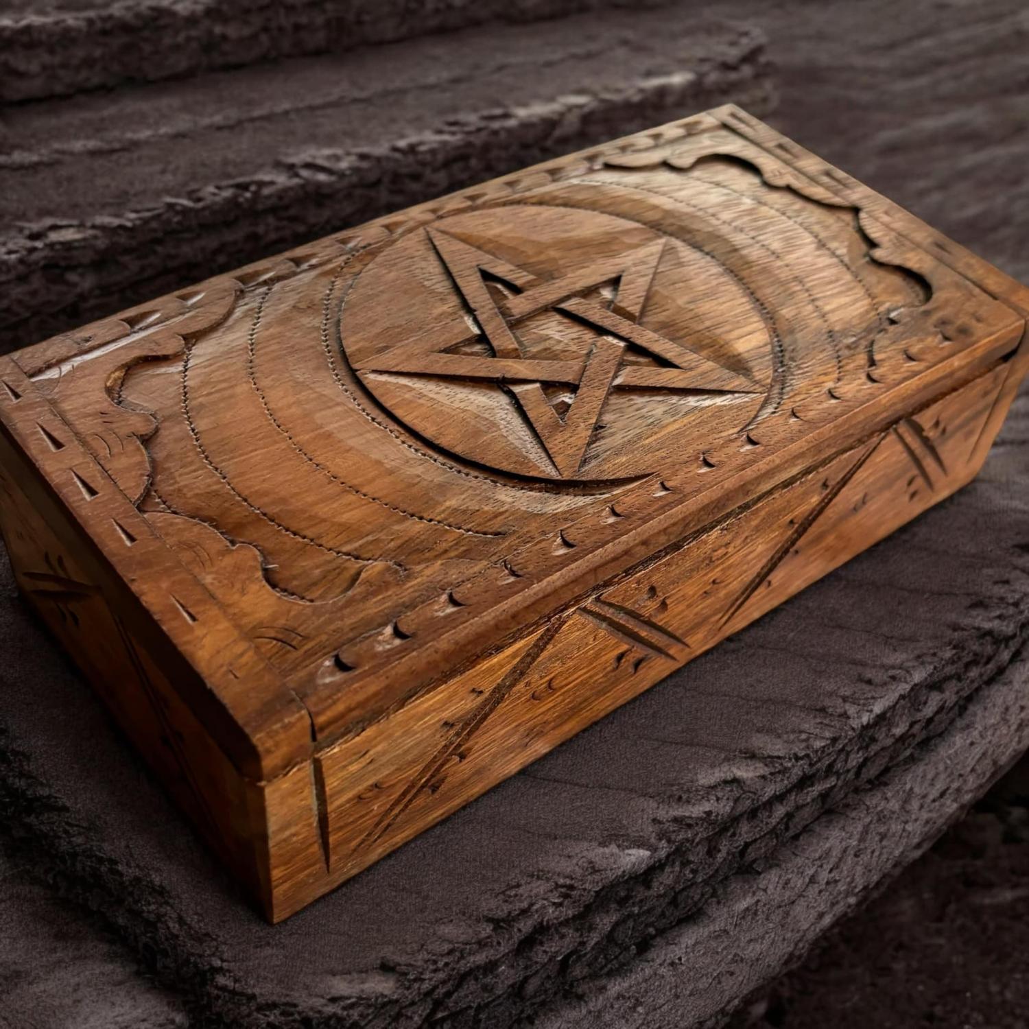 Coffret de sorcière en bois avec un décor pentacle - dimension 9,5 X 19 X 5cm