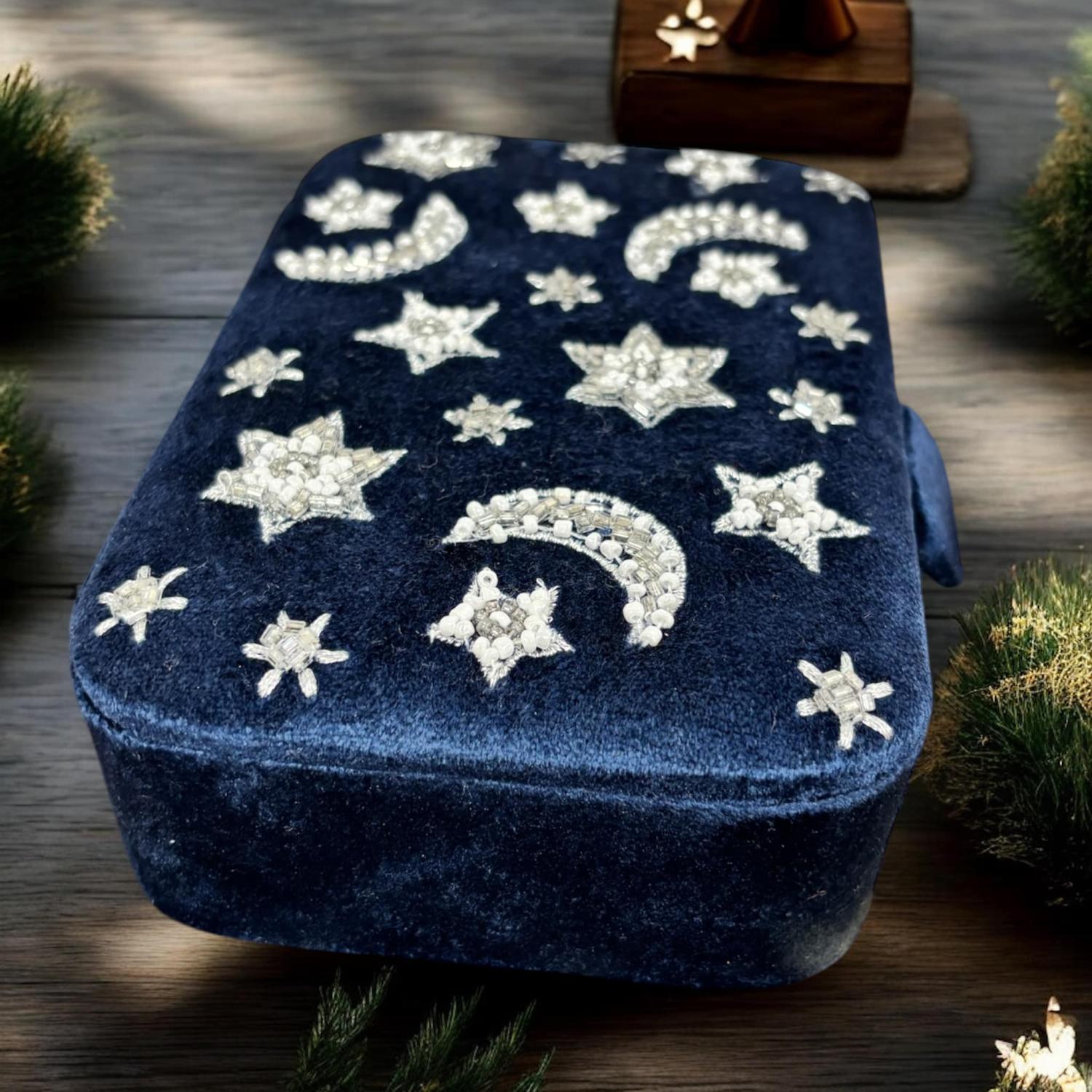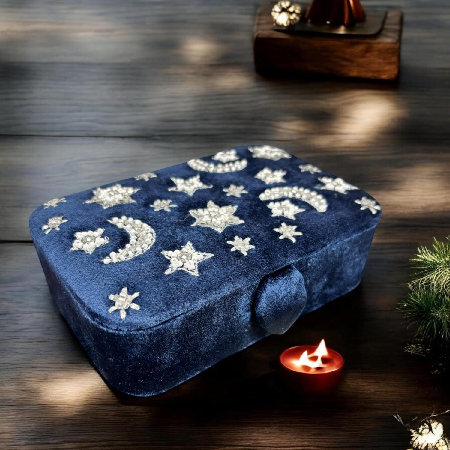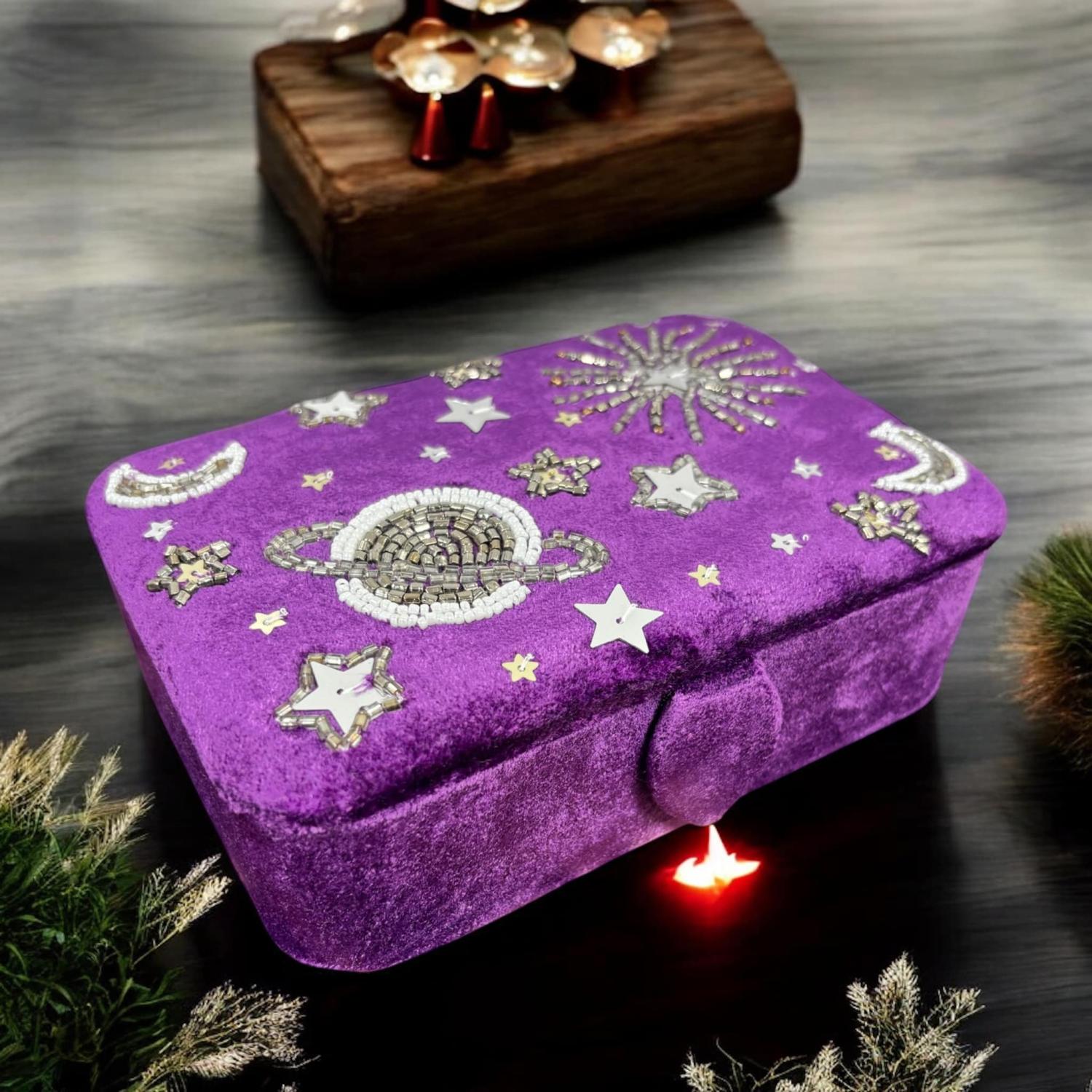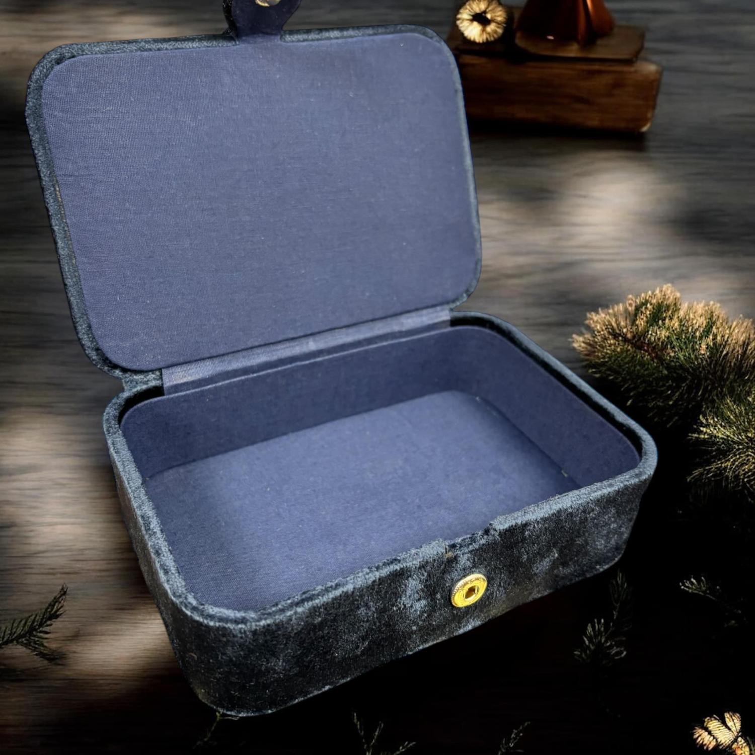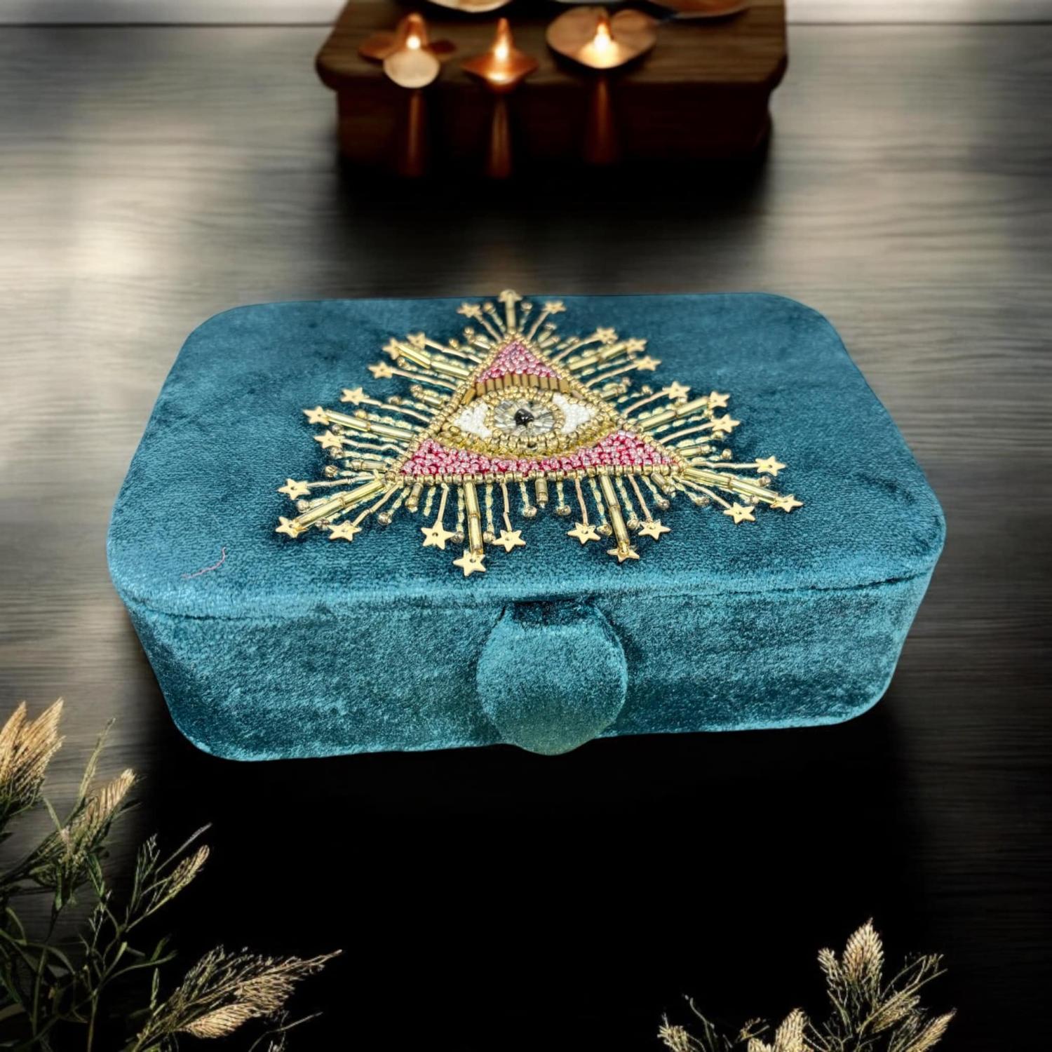 Coffret à bijoux/tarot avec broderie fine et perles décoratives. Ces boîtes sont dotées d'un extérieur en velours doux avec une broderie complexe, ce qui en fait une pièce belle et fonctionnelle pour ranger de petits trésors. Les couleurs riches et les détails raffinés leur confèrent une présence unique dans toute collection.