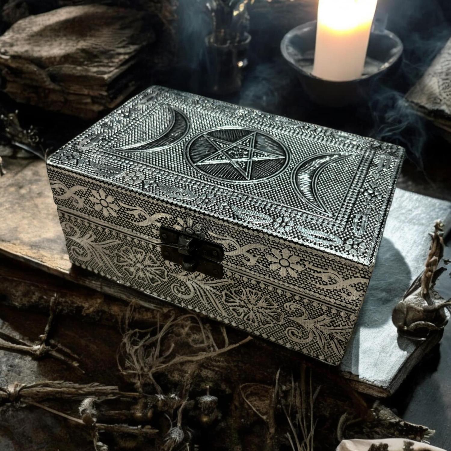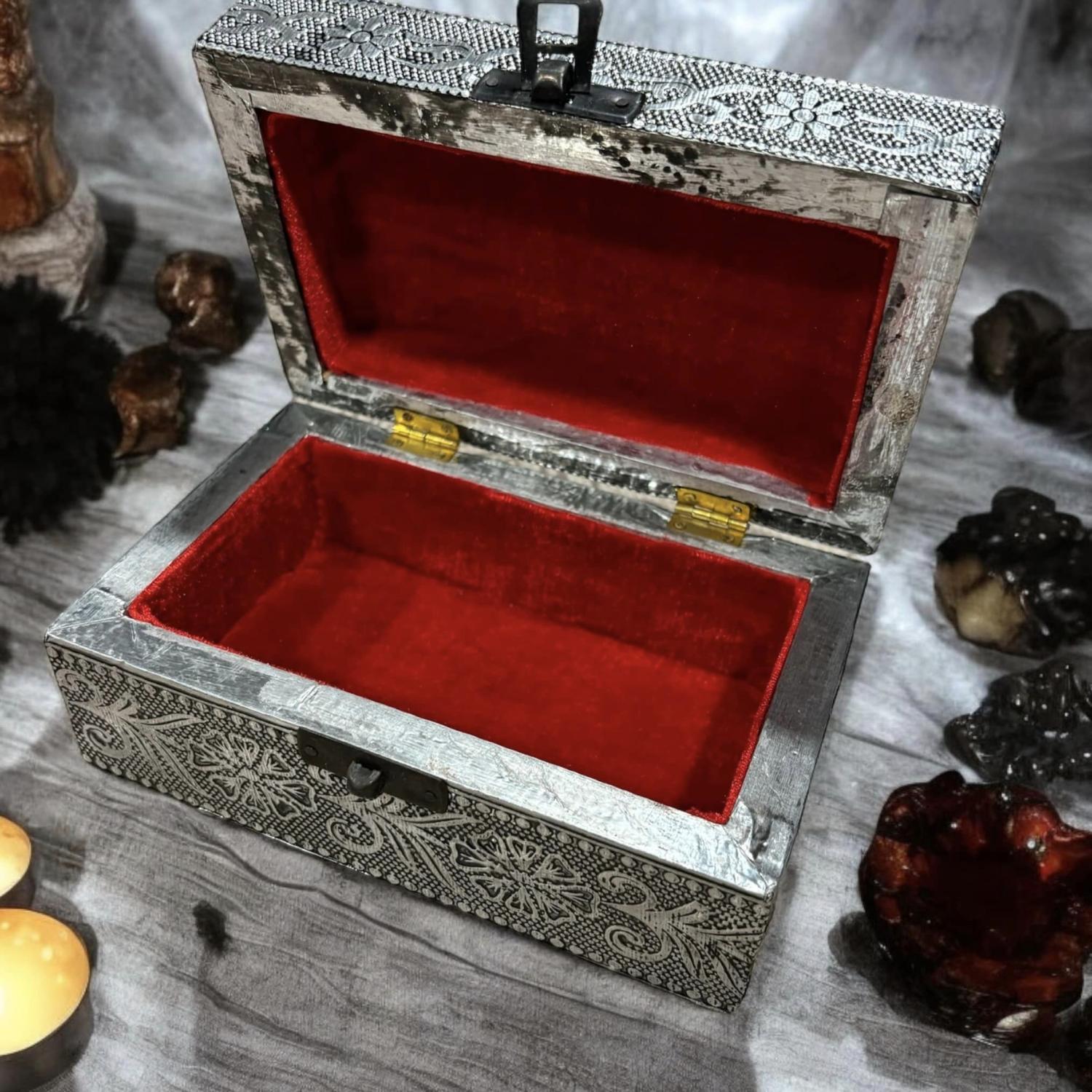 Une jolie boite pour renfermer vos secrets, parchemins, bijoux etc... . Cette boîte est tapissé en velours rouge à l'intérieur. Elle mesure 20X8X8 cm.