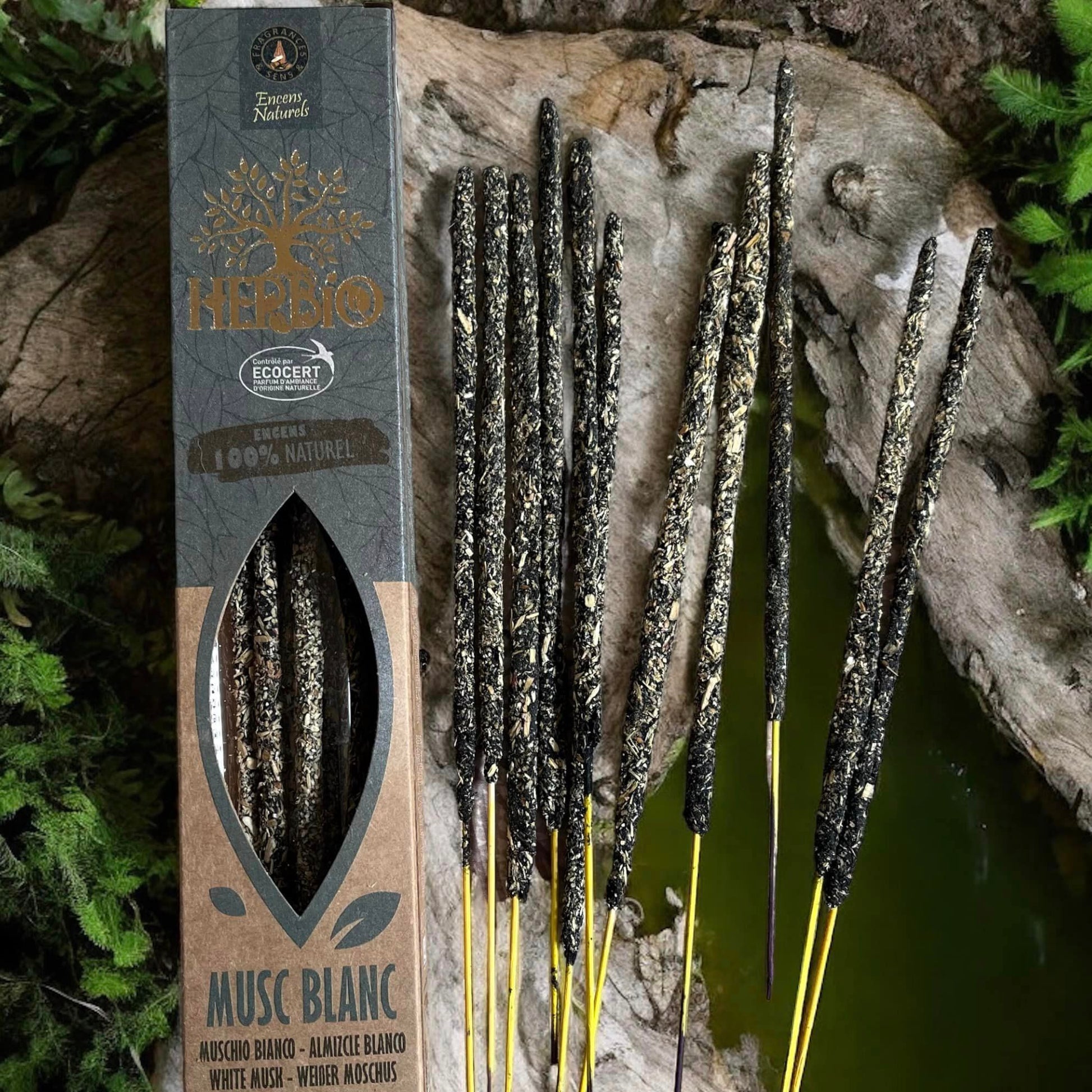 Boîte de 10 bâtonnets d'encens Herbio musc blanc. Le parfum du musc blanc est unique et rappelle l'arome du café mélangé à des délicieuses notes florales. Le musc est un parfum qui invite au voyage et à la paix intérieure.