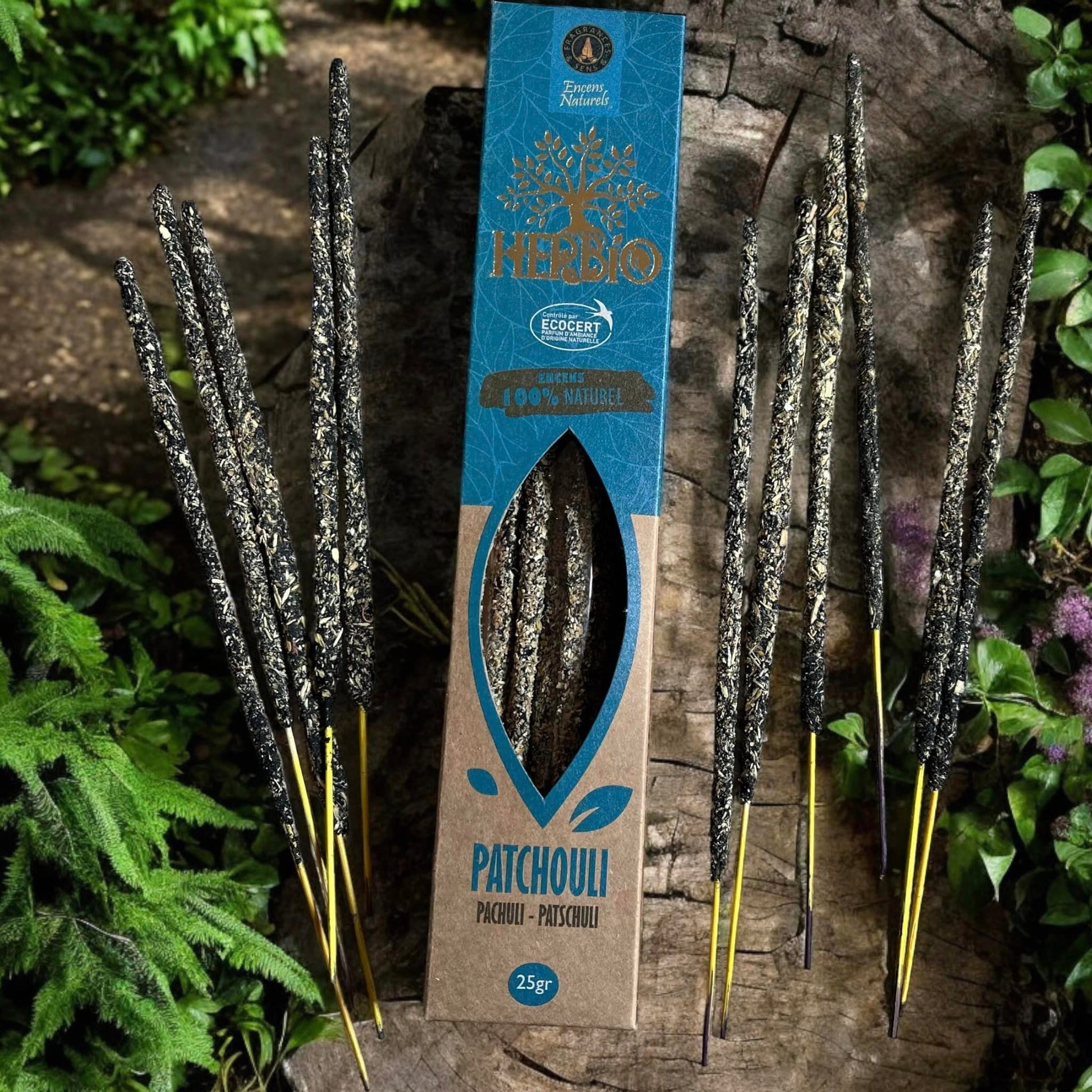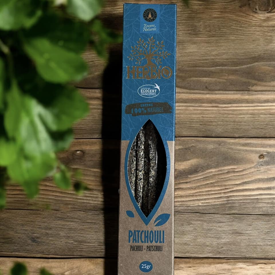 Encens en bâtonnets naturels Herbio, boîte de 10bâtons d'encens au patchouli . Le parfum sensuel du patchouli est connu pour stimuler les élans amoureux. Le patchouli est aussi un parfum qui chasse la tristesse et apporte un peu de réconfort lors de moments difficiles. Il favorise un meilleur état d'esprit positif. Ces encens sont idéal à avoir chez vous au quotidien.