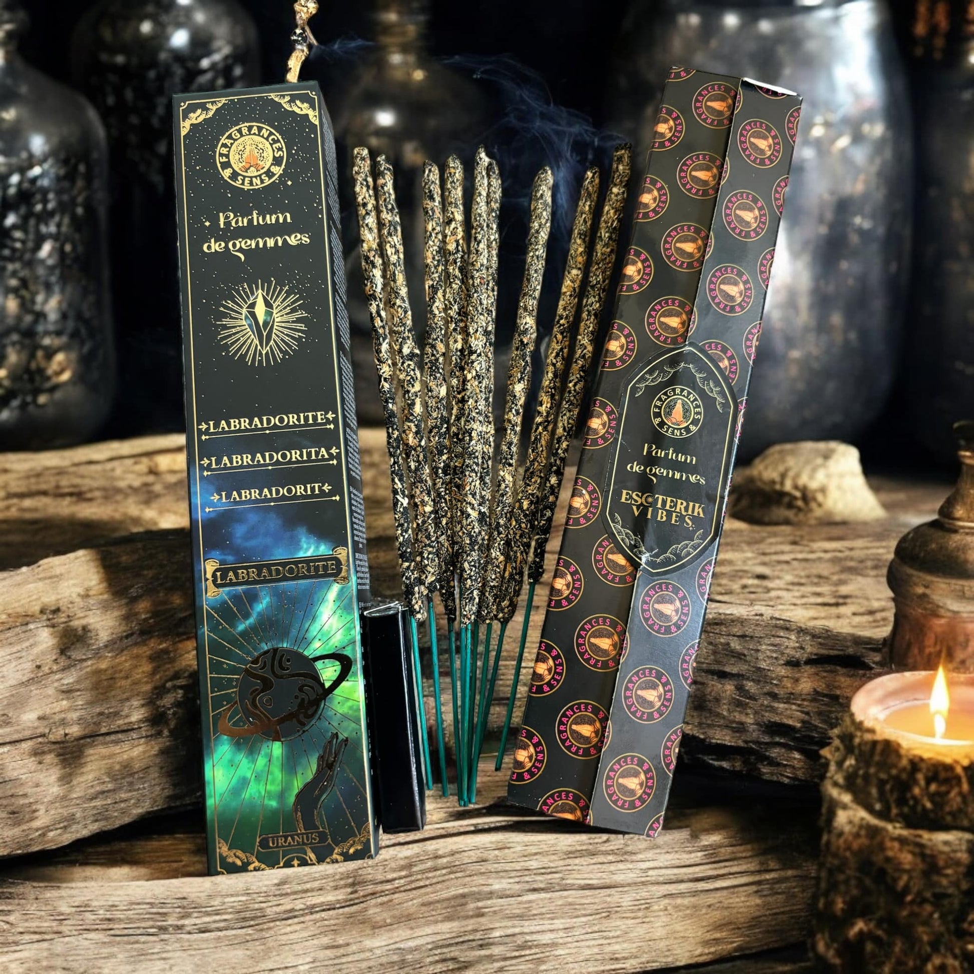 LABRADORITE - Uranus: Liée à Uranus, la planète de l'innovation, favorise la créativité, l'intuition et la libération des émotions, encourageant l'originalité et l'adaptabilité. Parfum de Gemmes, la nouvelle ligne d’encens naturels de la marque Fragrances & Sens, renfermant l'harmonie des fragrances en lien avec la planète uranus et la pierre de labradorite.