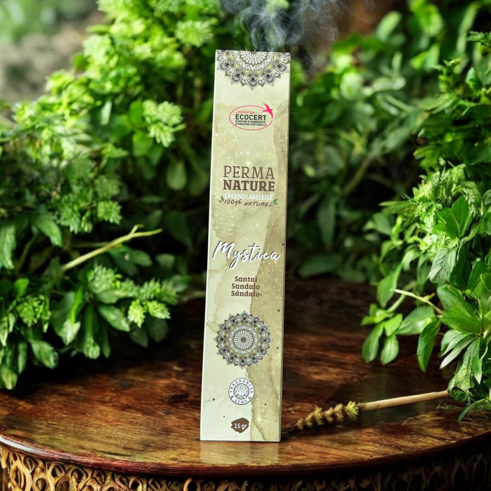 Découvrez l'encens Mystica Bois de Santal de la gamme Permanature, une invitation au voyage sensoriel à travers des senteurs boisées et apaisantes. Fabriqué selon un savoir-faire traditionnel, cet encens est certifié Ecocert, garantissant une composition 100% naturelle, sans additifs ni produits chimiques.