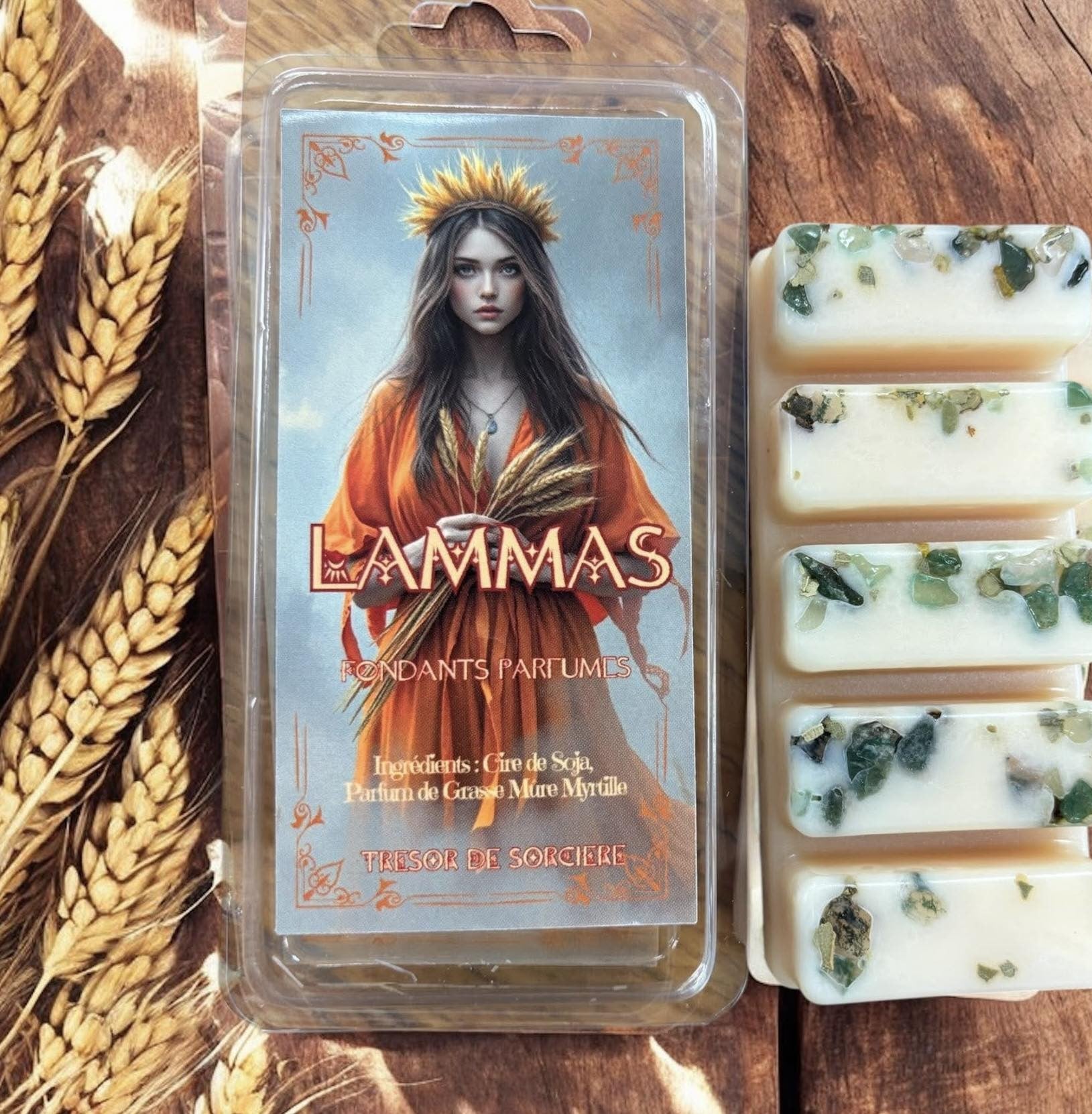 Pour la célébration de Lammas ou pour le plaisir ces fondants sont parfumés à la myrtille mûre. C'est un délicieux parfum fruité et gourmand. Il sont de la couleur jaune ou et infusés dans des pierres d'agate mousse et d'ambre.