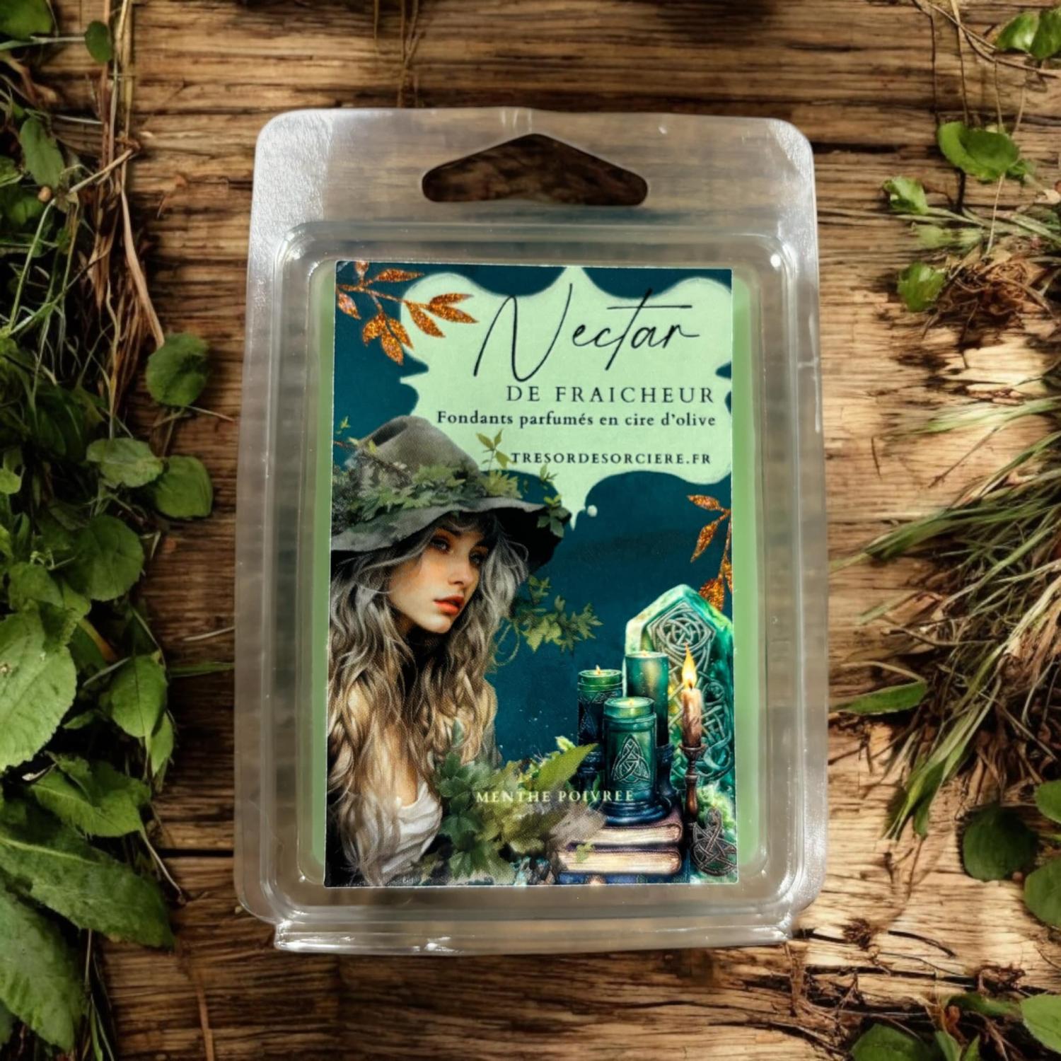Ces délicieux fondants sont parfumés à la menthe poivrée. Chaque fondant stimule et revivifie vos sens. Le parfum de menthe poivrée des fondants nectar de fraicheur est un véritable souffle de fraicheur, et est idéal pour purifier l'atmosphère et revitaliser l'esprit. Des cristaux d'aventurine on été infusés dans la cire d'olive, elle est connue pour être une pierre favorisant l'abondance mais c'est aussi une pierre en lien avec la nature qui favorise l'harmonie er l'équilibre intérieur.