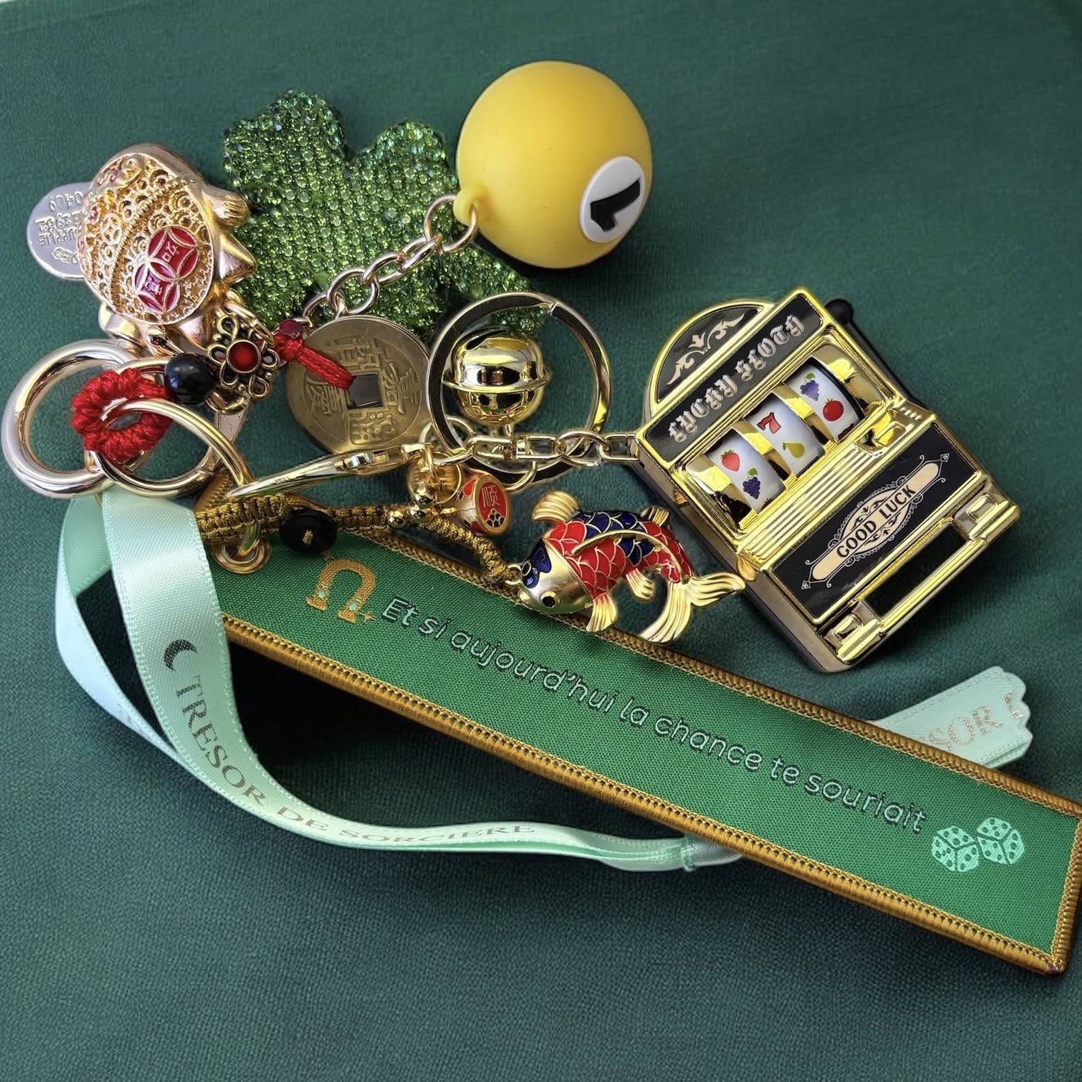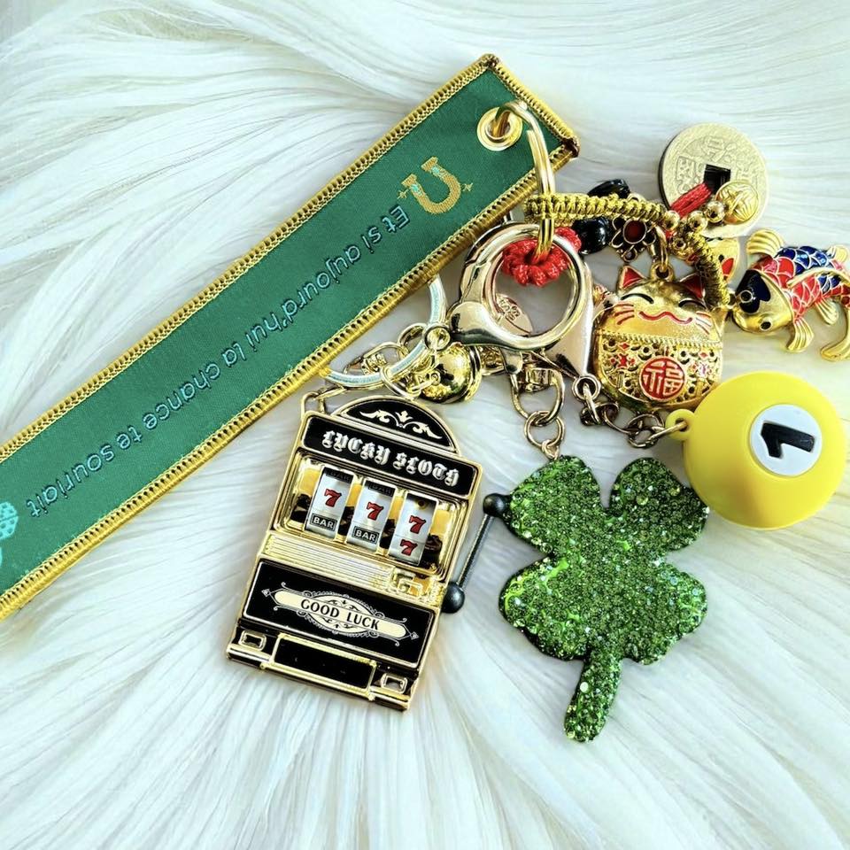 Gri-gri porte-clés "Et si la chance te souriait aujourd'hui", un allié de lumière, un gardien d’énergie bienveillante. Il veillera sur toi, sur tes déplacements avec ses symboles de chance. Il est composé d'une machine à sous, d'un trèfle à 4 feuilles, d'un chat de la fortune, d'une boule de billard (coloris aléatoire), d'une clochette, d'un ruban vert et d'une dragonne trésor de sorcière, Porté sur tes clés, il devient ton compagnon de chance.
