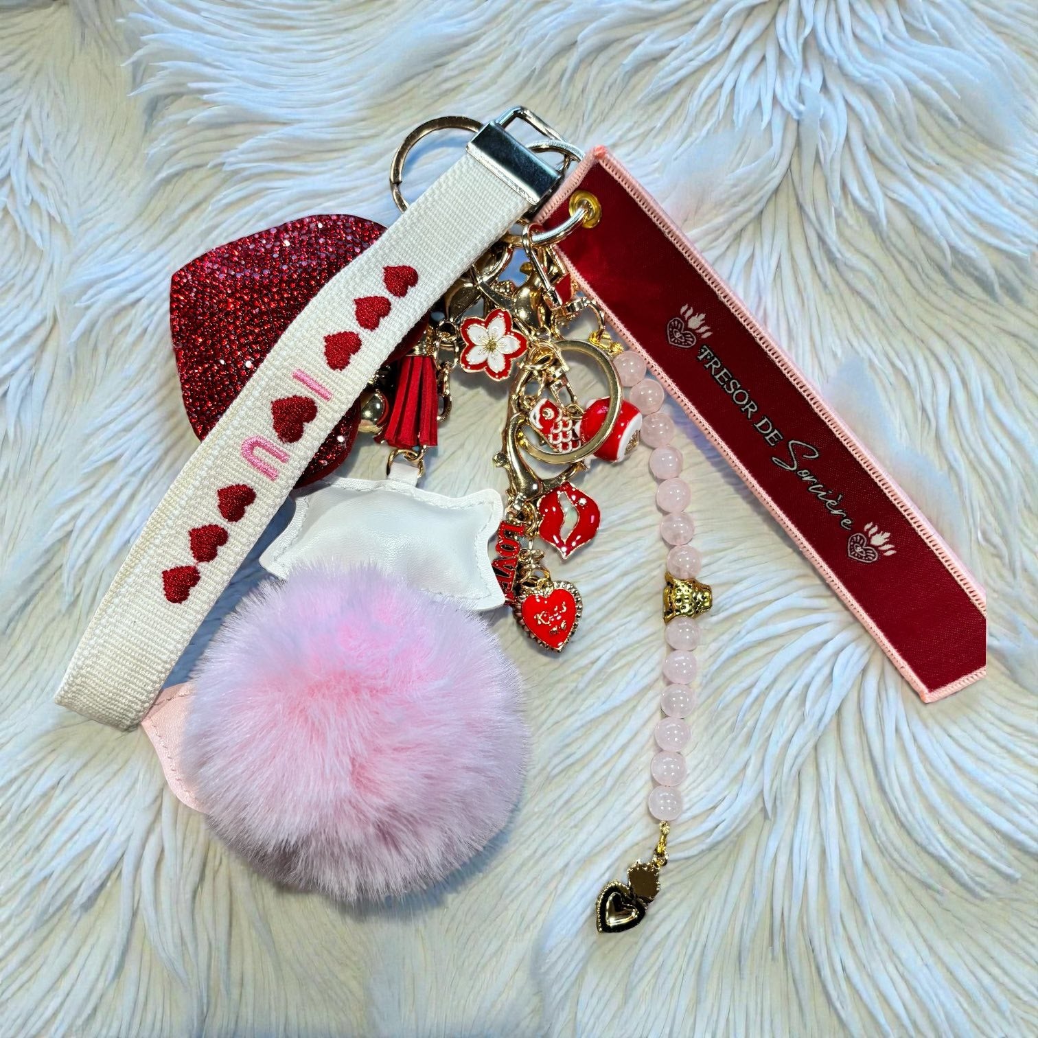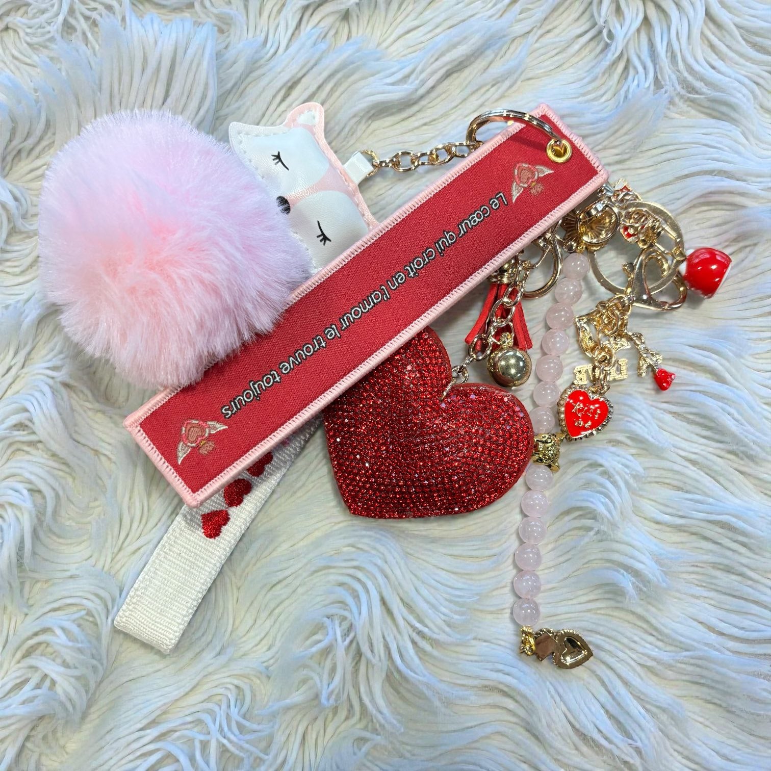 Attirez l’amour, la douceur et les énergies bienveillantes partout avec vous grâce à ce porte-clés gri-gri dédié au cœur "le coeur qui croit en l'amour le trouve toujours"💗 Composé d’une boule rose, d'un fil de en pierre de quartz rose, pierre emblématique de l’amour, de la tendresse et de l’harmonie émotionnelle, ce gri-gri agit comme un talisman protecteur et réconfortant. Sa dragonne pratique, ses breloques symboliques liées à l’amour et son cœur rouge en font un objet à la fois magique et chargé d’intention. À glisser sur vos clés, votre sac ou à offrir à un être cher.