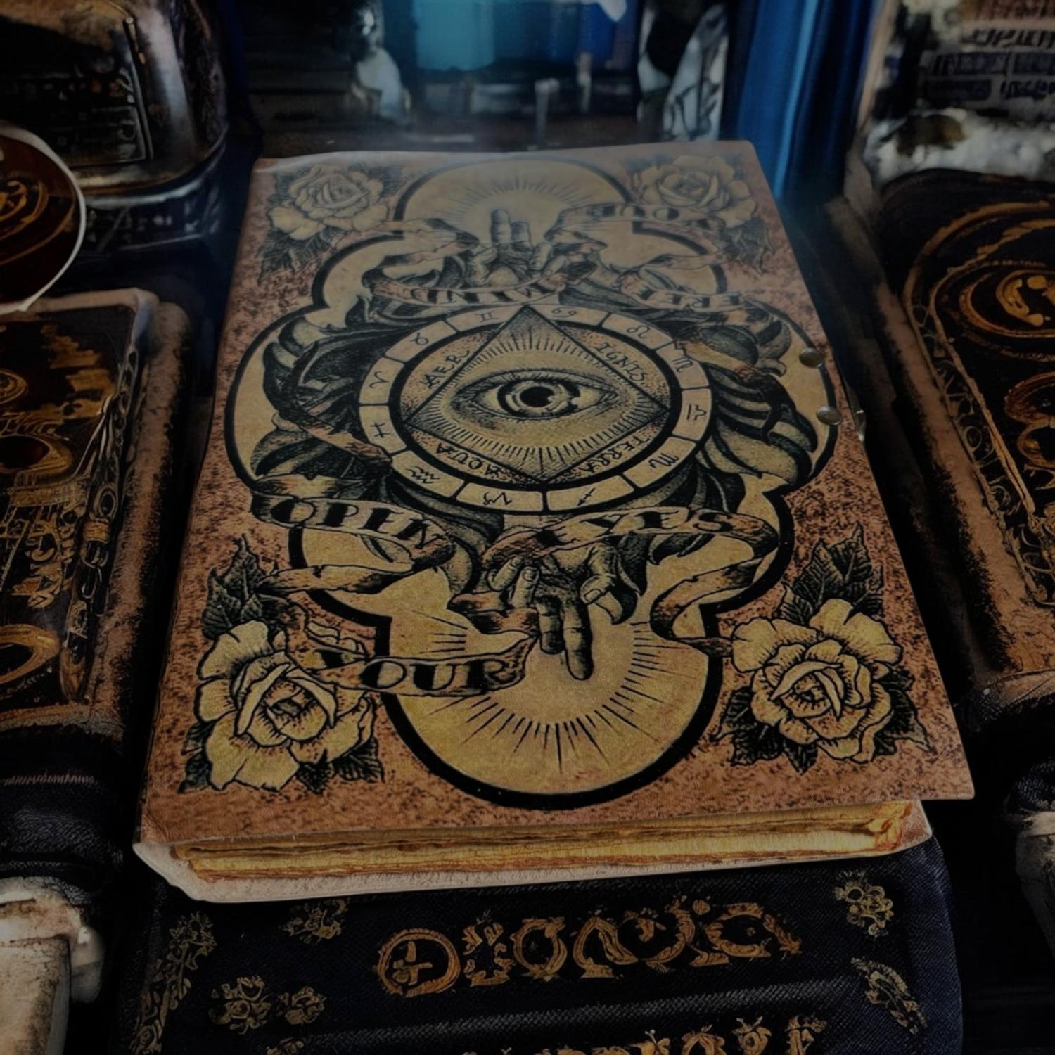 Un joli grimoire de sorcière décor oeil divinatoire qui vous sera très utile pour y consigner vos recettes magiques, vos rituels et vos secrets de sorcière. il est fait de papier vintage unique qui semble avoir été tiré de l'histoire. Vous allez adorer l'aspect ancien du papier coton fait main (200 pages). La serrure vintage gardera toutes vos écritures de valeur enfermées à l'intérieur. Reliure solide cousue à la main pour s'assurer qu'aucun papier ne se détache de votre carnet vintage. Il mesure 25 x 28 cm