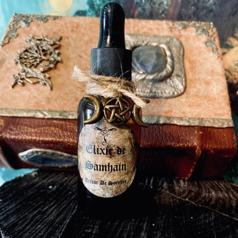 Cet élixir de Samhain est fait pour honorer cette célébration. Vous pouvez utiliser cette synergie d'herbes et d'huiles essentielles dans votre pratique magique pour oindre vos bougies le soir du nouvel an sorcières. Elle est composée de sauge blanche (purification), d'huile de benjoin (lien avec les morts) de romarin (mémoire et clarté mentale) de racine d’angélique (protection spirituelle) de résine d'oliban (esprit sacré), d'huile de patchouli et d'orange douce.