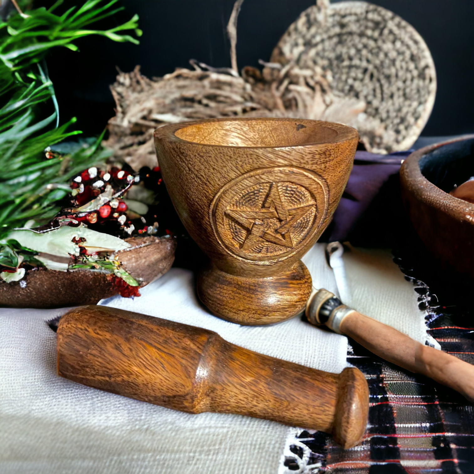 un ensemble parfait mortier et pilon en bois pour moudre, réduire en poudres vos herbes, encens et préparations magiques.