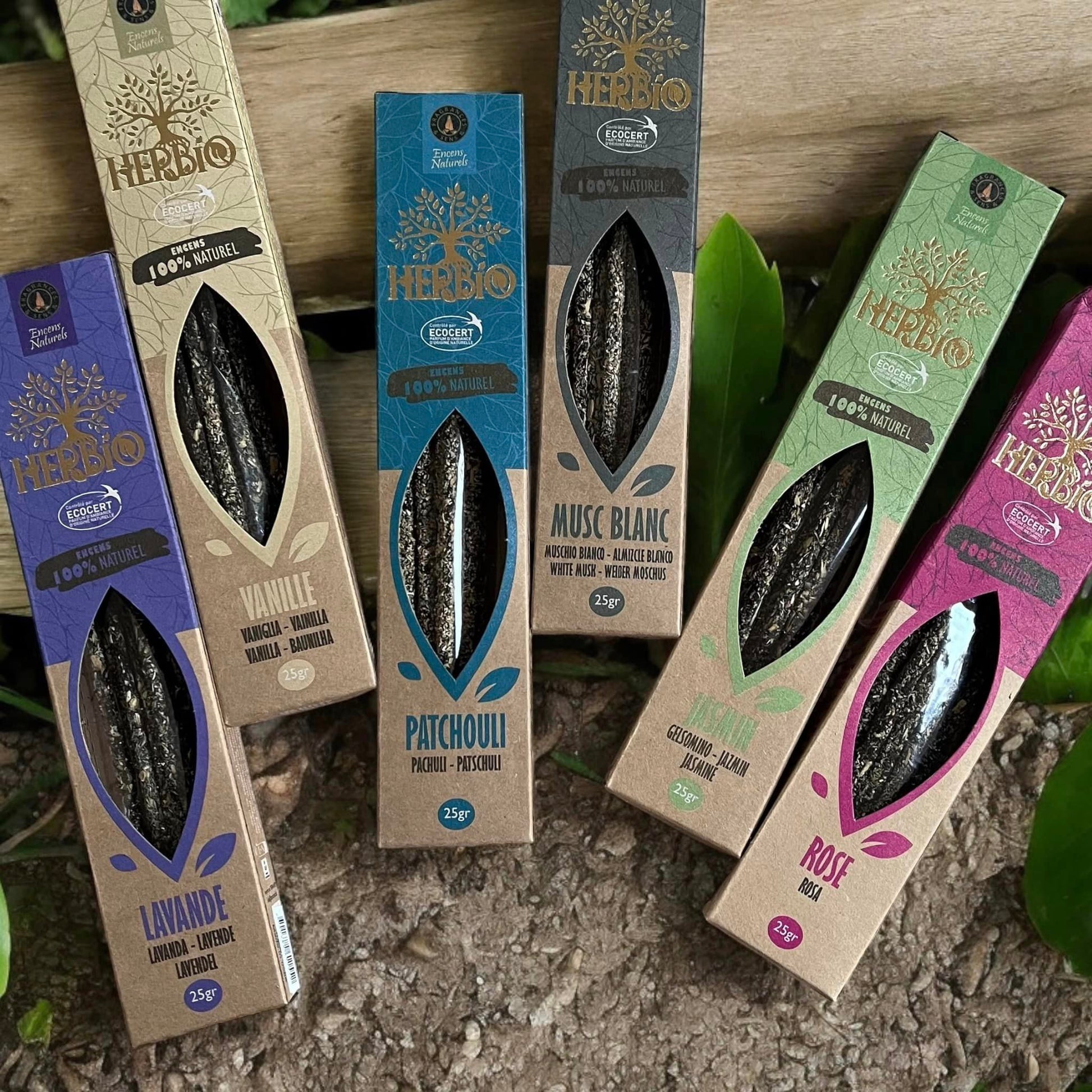 Pack de 6 boîtes de 10 bâtonnets d'encens herbio - vanille, musc blanc, rose, jasmin, patchouli, lavande. 1 porte encens est offert avec ce pack d'encens.