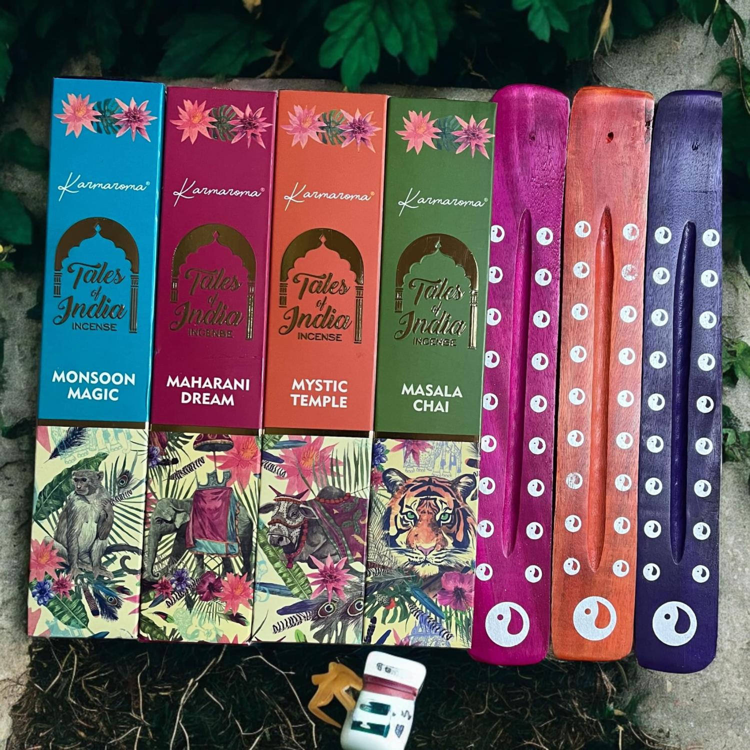 Pack de 4 paquets encens Tales of India ( thé aux épices, temple mystique, rêve de Marahani et magie de la mousson) + 1 porte encens coloris aléatoire 'rose, vert, jaune, rouge ou violet)