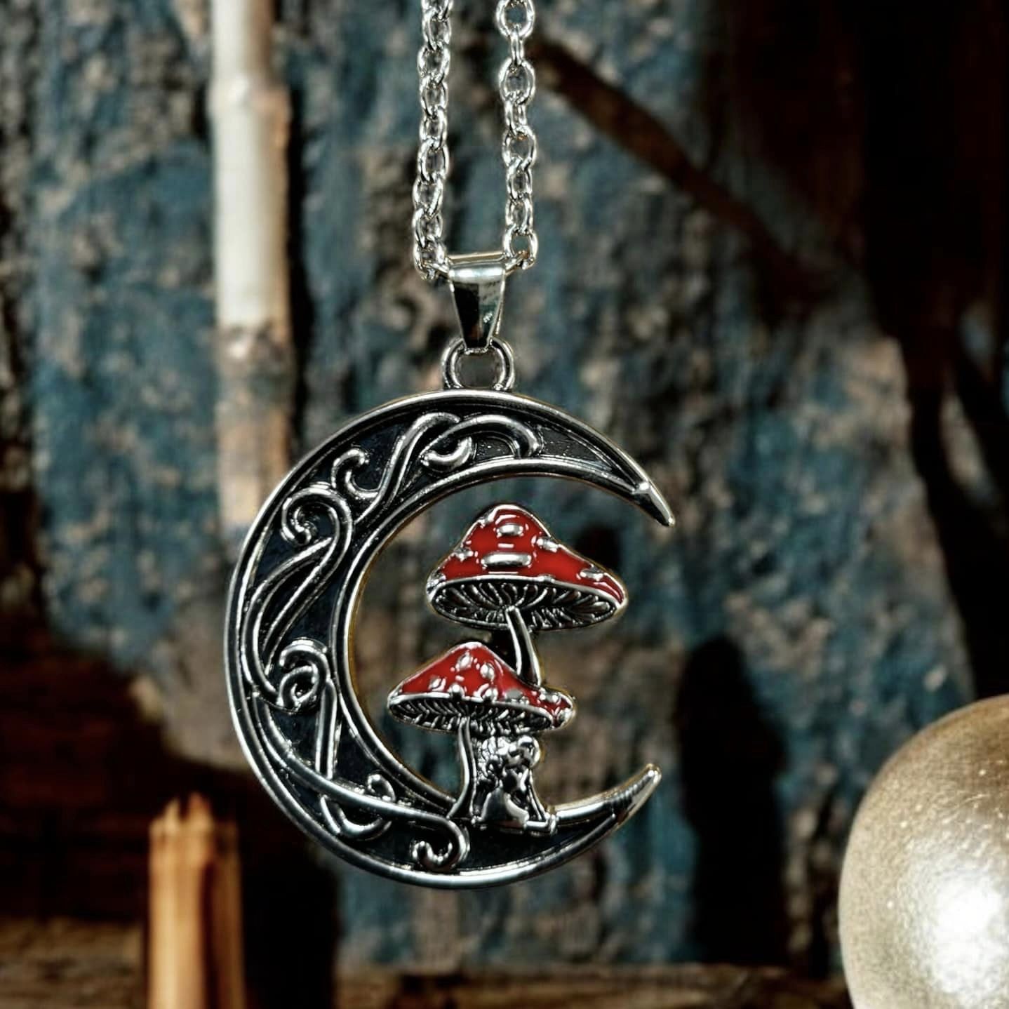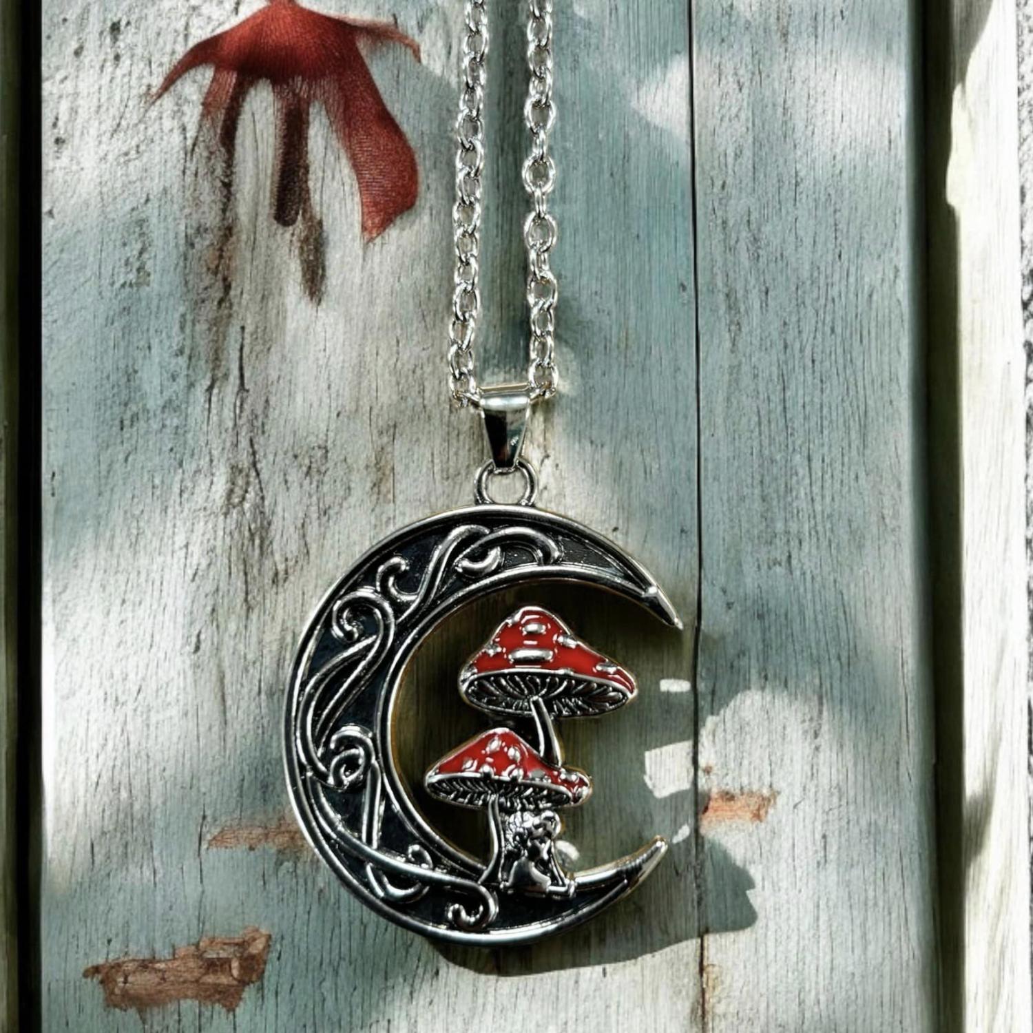 Un joli pendentif ésotérique qui représente un croissant de lune orné de champignons mpagiques. Il est livré avec sa chaine de 60 cm. Il est en acier inoxydable de belle qualité. Hauteur du pendentif 3.5 cm sans le mousqueton.
