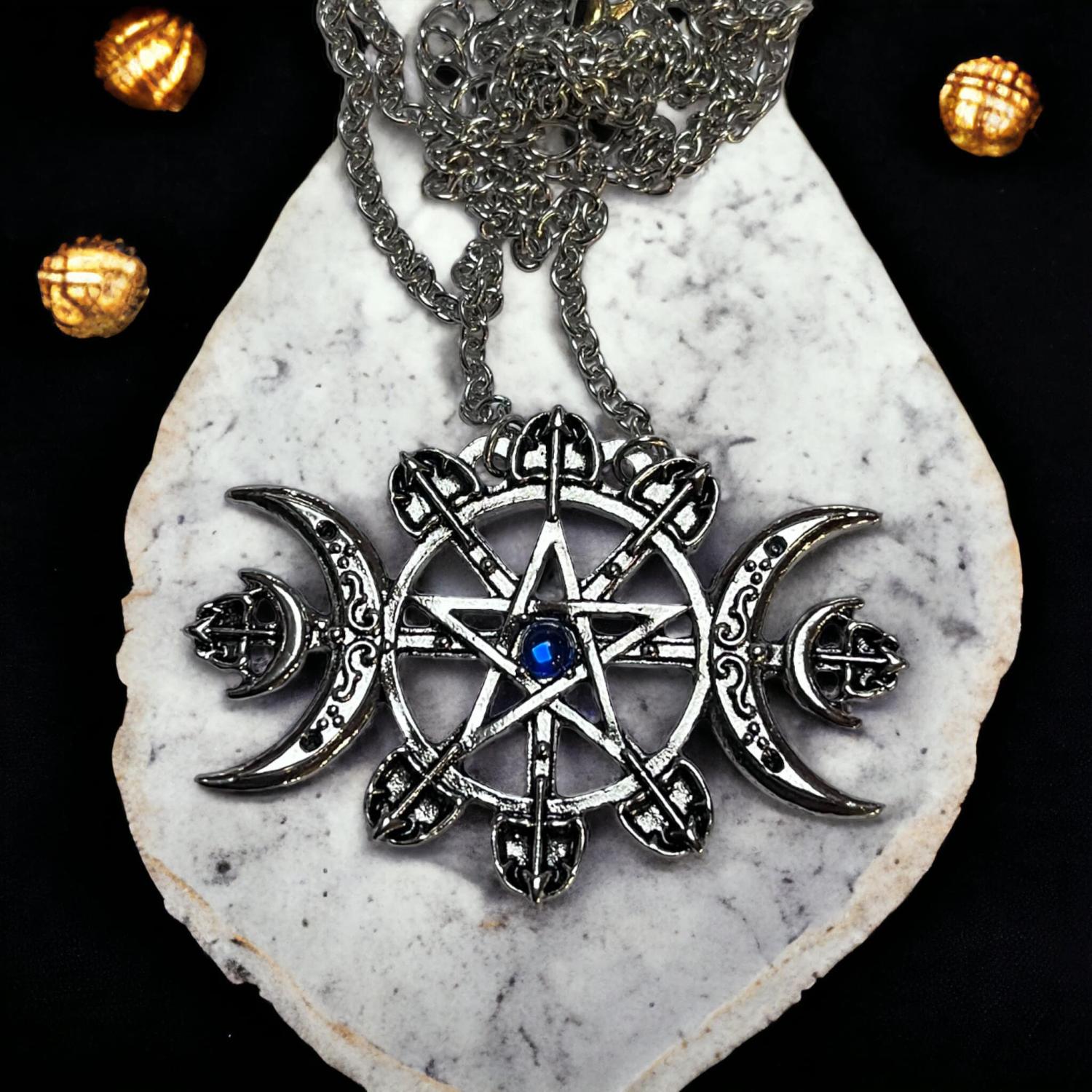 Il est associé aux pouvoirs de protection divin et est utilisé pour se protéger des forces du mal, des énergies mauvaises, et des démons. Ce pendentif est un pendentif de protection. Le symbole de triple lune incarne la naissance, la vie et la mort par trois phase le croiisant de lune (la jeune fille), la pleine lune(la mère) et la lune décroissante (la vieille femme).
