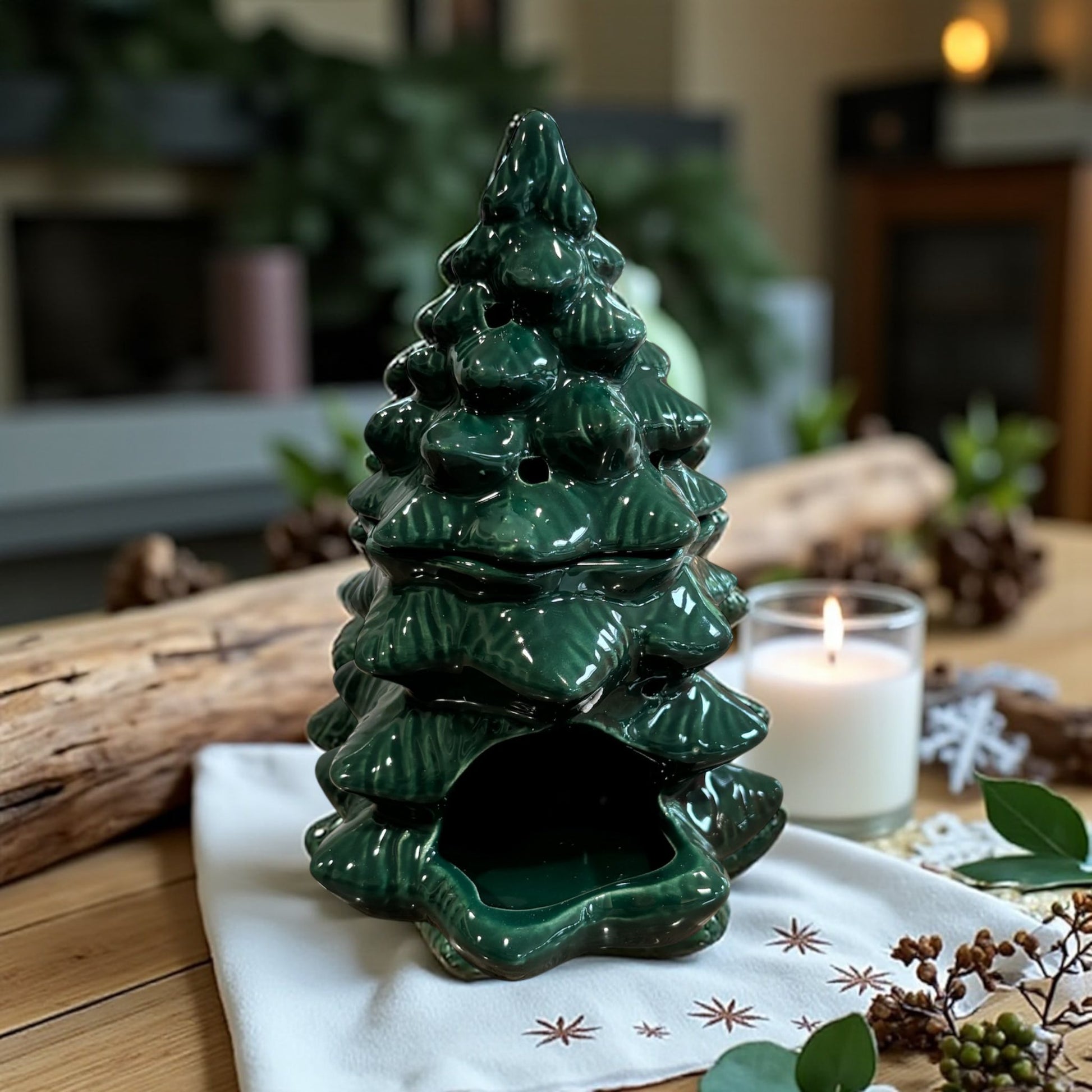 Cet élégant brûleur à cire en céramique motif sapin vert apporte une touche festive à n'importe quel espace. Parfait pour les fondants de cire et les huiles parfumées, il embellira votre décoration saisonnière tout en parfumant votre intérieur de vos senteurs hivernales préférées. Placez simplement une bougie chauffe-plat standard dans l'espace prévu à cet effet et un délicieux fondant de cire dans la coupelle. Retirez toujours le couvercle pendant l'utilisation. dimension 18x13x12 cm.