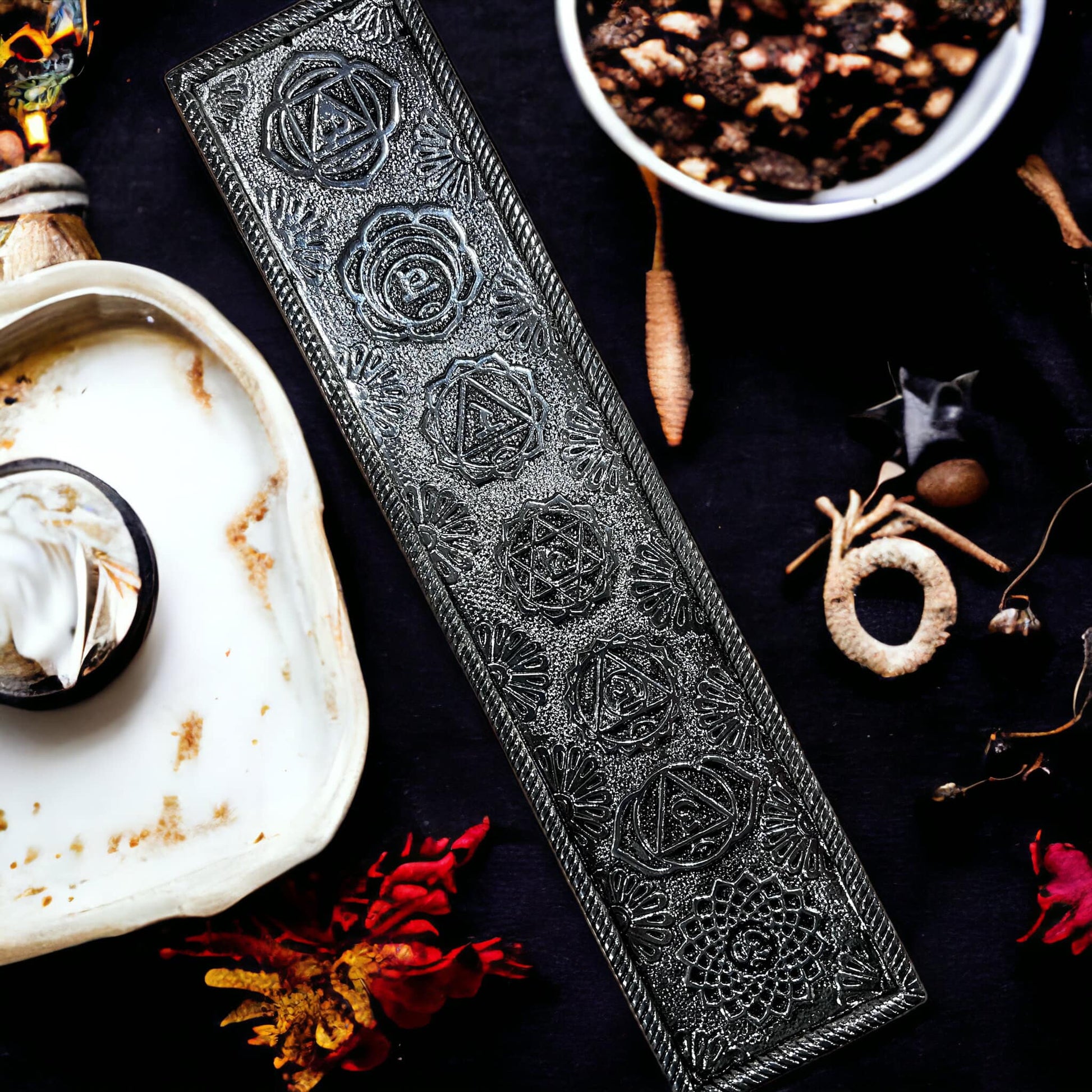 Porte encens en métal "7chakras" de bonne largeur de 6cm sur 28 cm de longueur pour encens en batônnets.