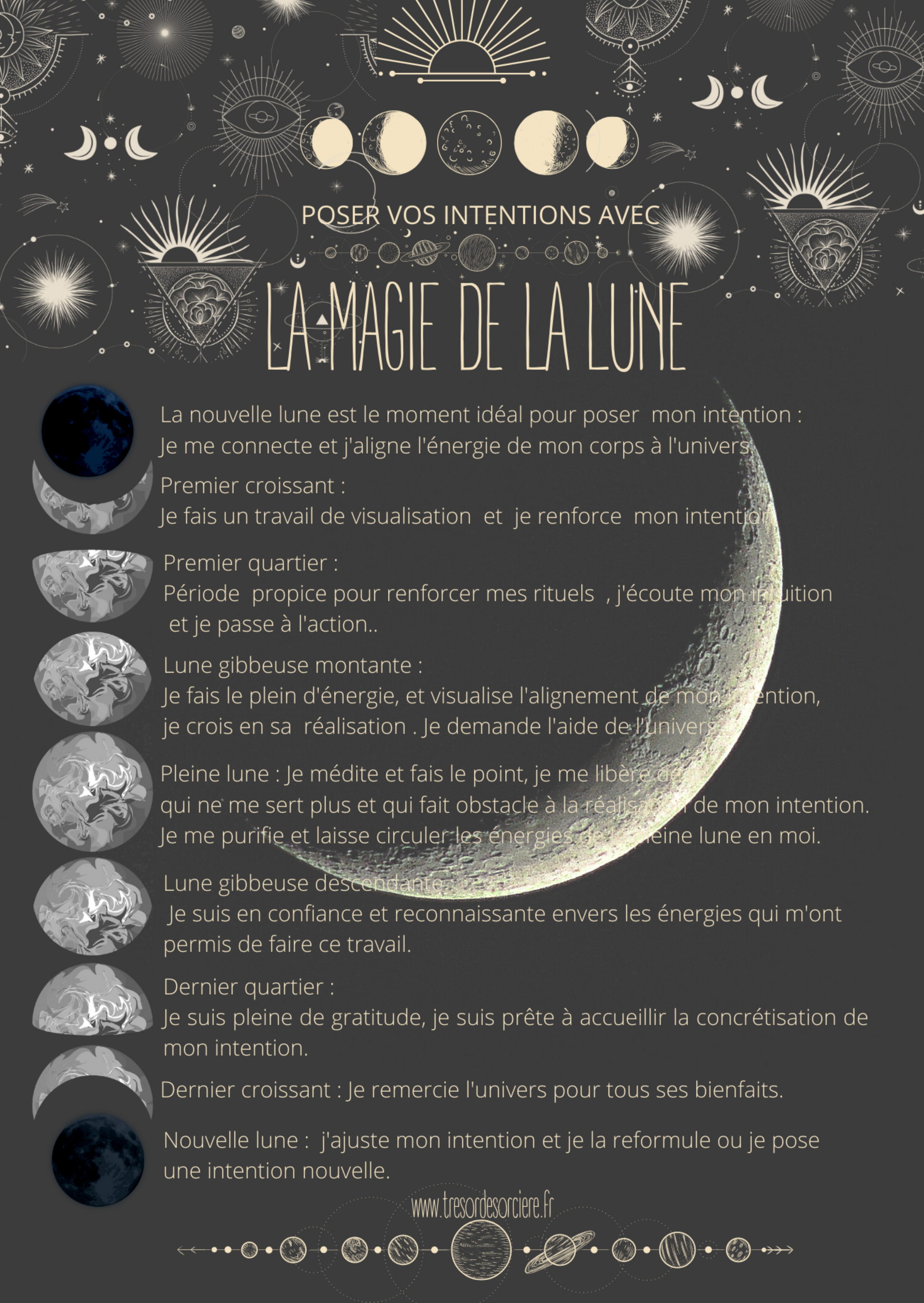 Posez vos intentions avec le poster "Magie de la lune". Il mesure 30X42 cm et est plastifié. Accrochez le près de votre autel ou mettez le en valeur dans un joli cadre.