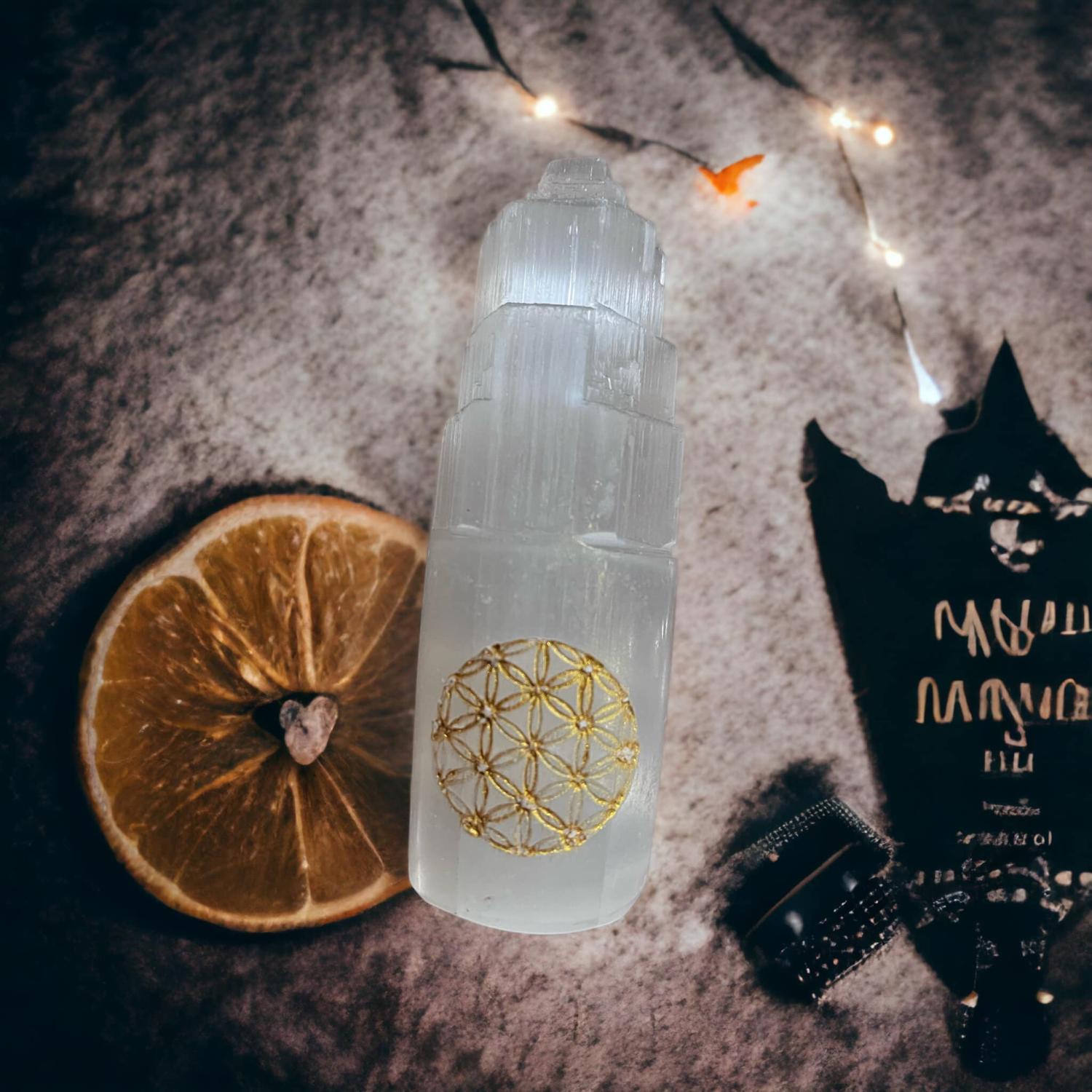 Petite tour de sélénite de 10 cm de hauteur avec une fleur de vie gravée.