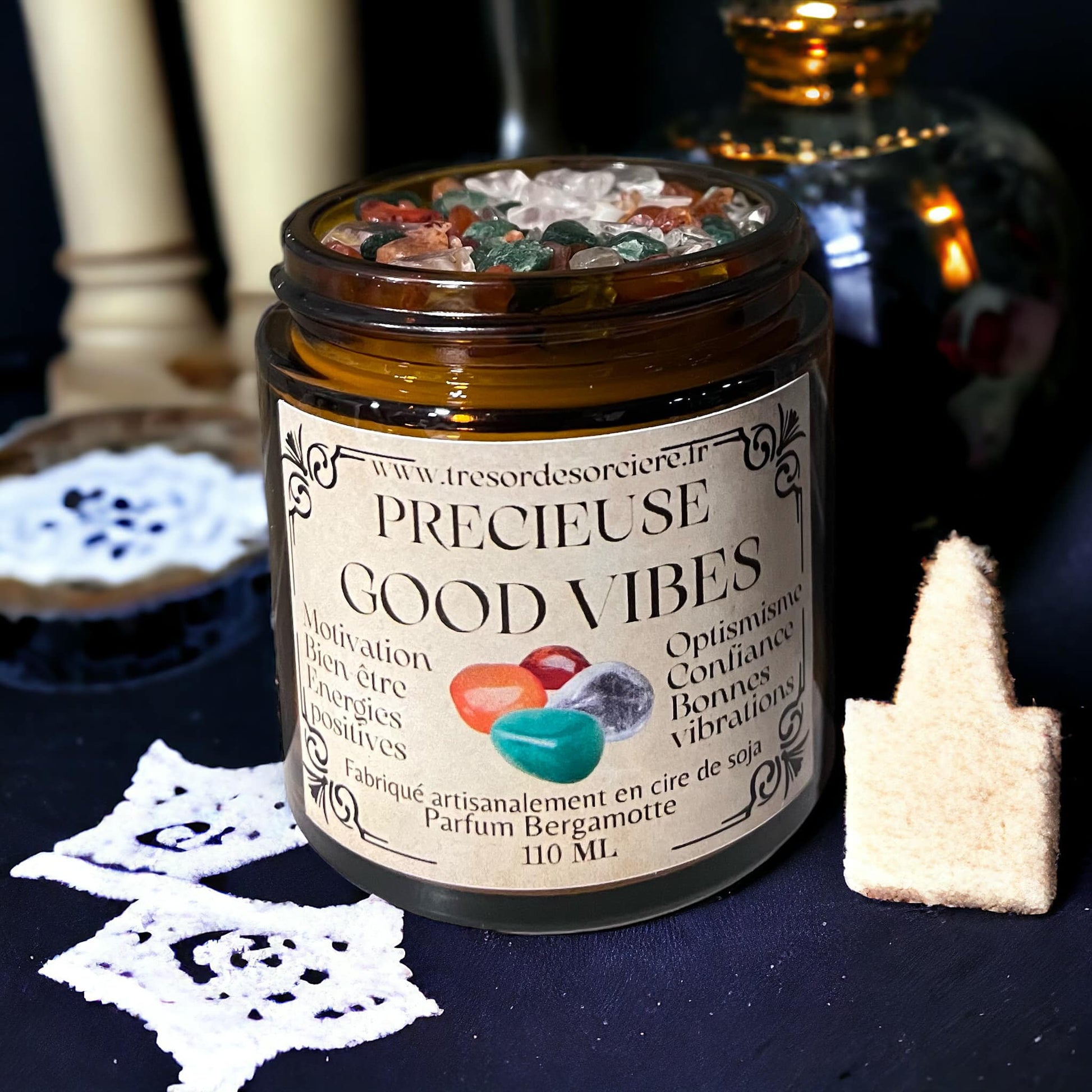 Les précieuses sont des bougies parfumées et chargées par l’énergie des cristaux qui les accompagnent.